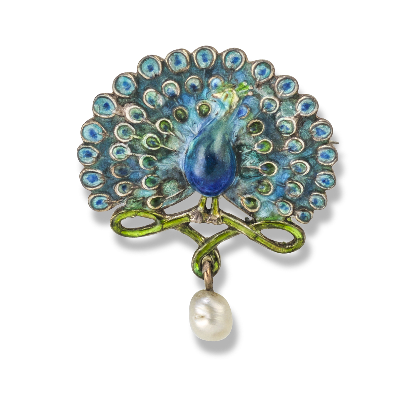 A polychrome enamel peacock brooch by Child & Child, c1905, suspending a baroque pearl in silver and gold, 2.8cm high, maker's mark to reverse, fitted case by Child & Child