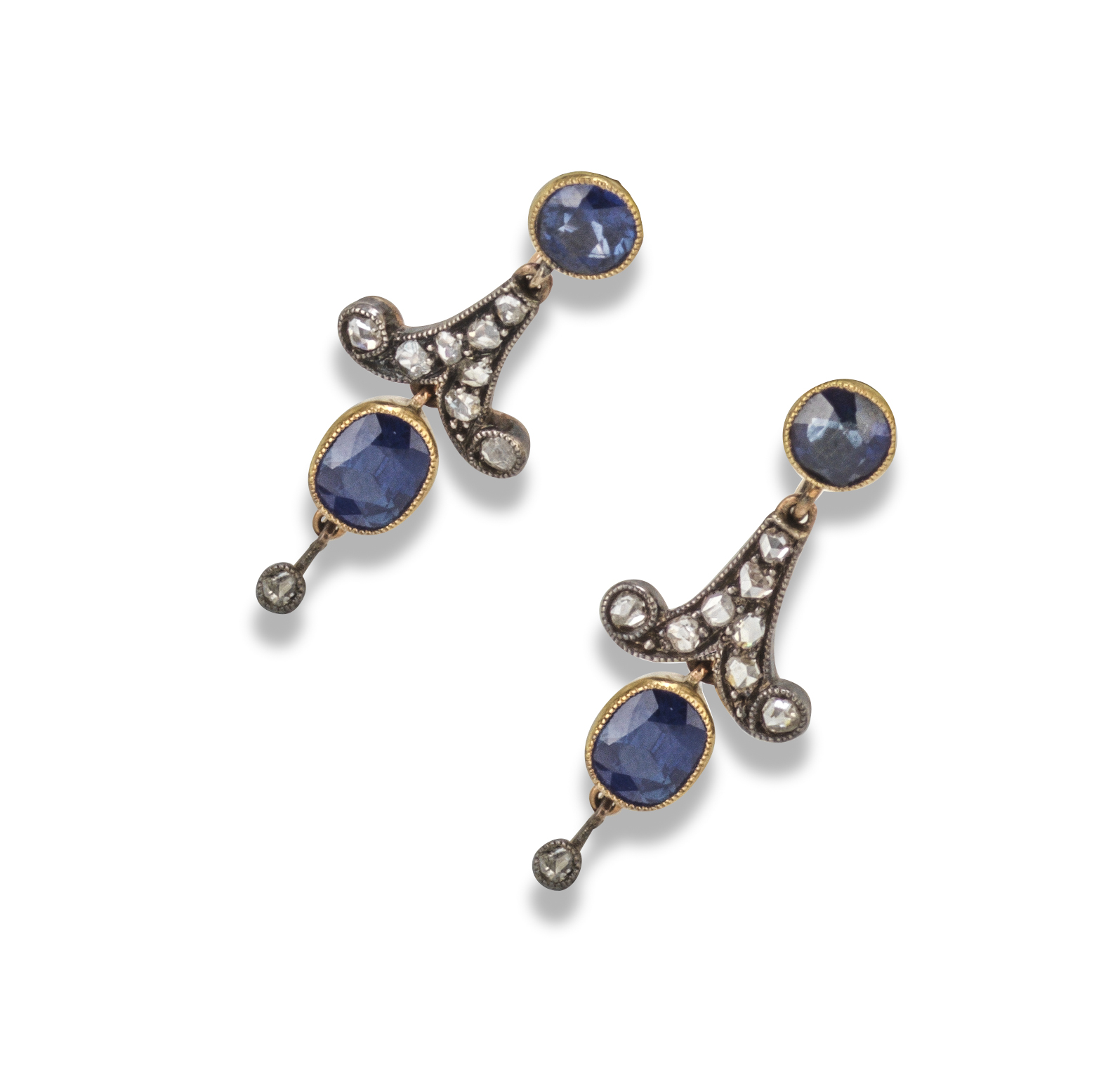 A pair of sapphire and diamond earrings by Child & Child, c1905, the cushion-shaped sapphires each suspending rose-cut diamond-set cusp sections and suspending oval-shaped sapphire and diamond drops in silver and gold, 3cm high, sapphires approximately 2.00cts total, maker's mark for Child & Child