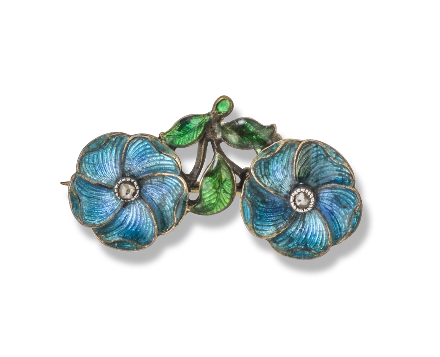A silver flower brooch by Child & Child, c1905, the pair of flowers decorated with blue enamel petals, green enamel leaves and rose-cut diamonds to the centre in gold, rubbed maker's mark for Child & Child, 3cm wide