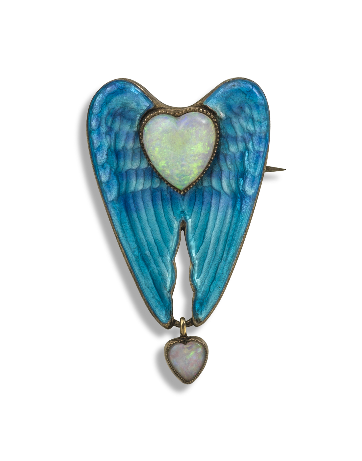 A blue enamel wings brooch by Child & Child, c1905, set with a heart-shaped opal and suspending a smaller heart-shaped opal in silver and gold, maker's mark, 4cm high, fitted case by Child & Child