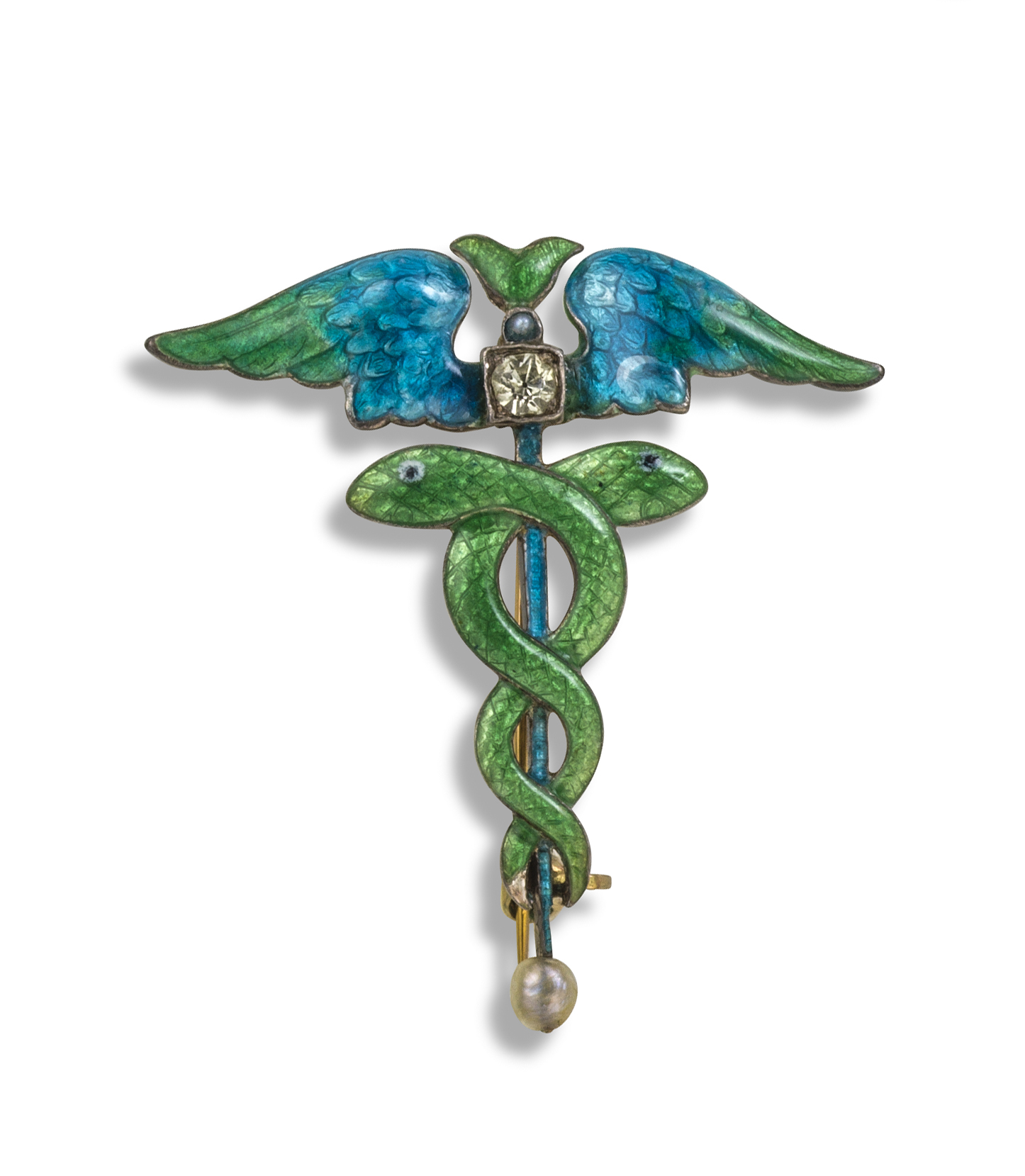 A green enamel caduceus brooch by Child & Child, c1905, decorated with green and blue enamel, white paste and a seed pearl in silver and gold, maker's mark for Child & Child, 3.5cm high, fitted case by Child & Child