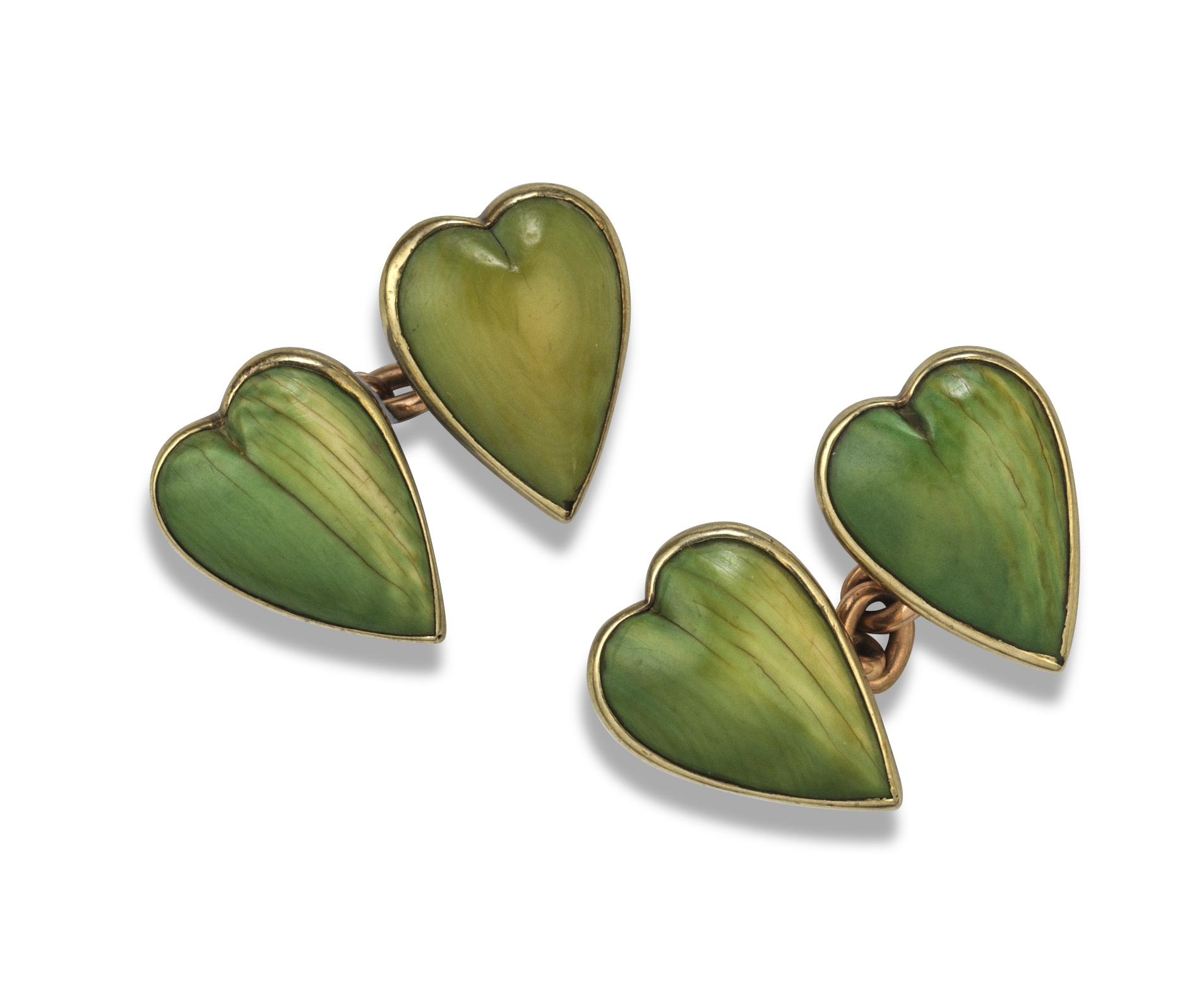 A pair of late Victorian stained ivory cufflinks by Child & Child, c1905, each terminal designed as a heart, collet set with a green stained ivory panel, conjoined by belcher links, signed with maker's mark, 1.5cm high
