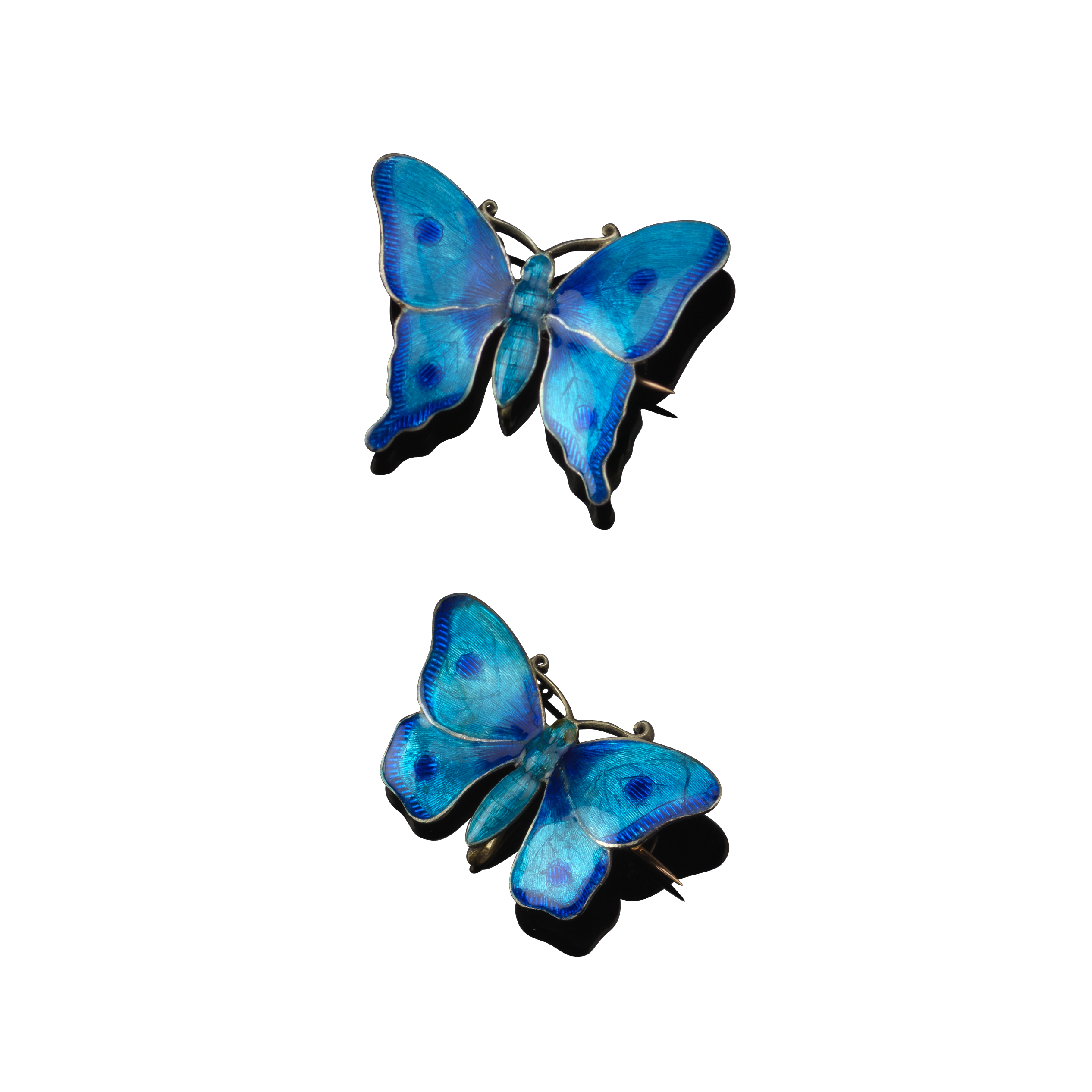Two silver gilt and blue enamel butterfly brooched by Child & Child