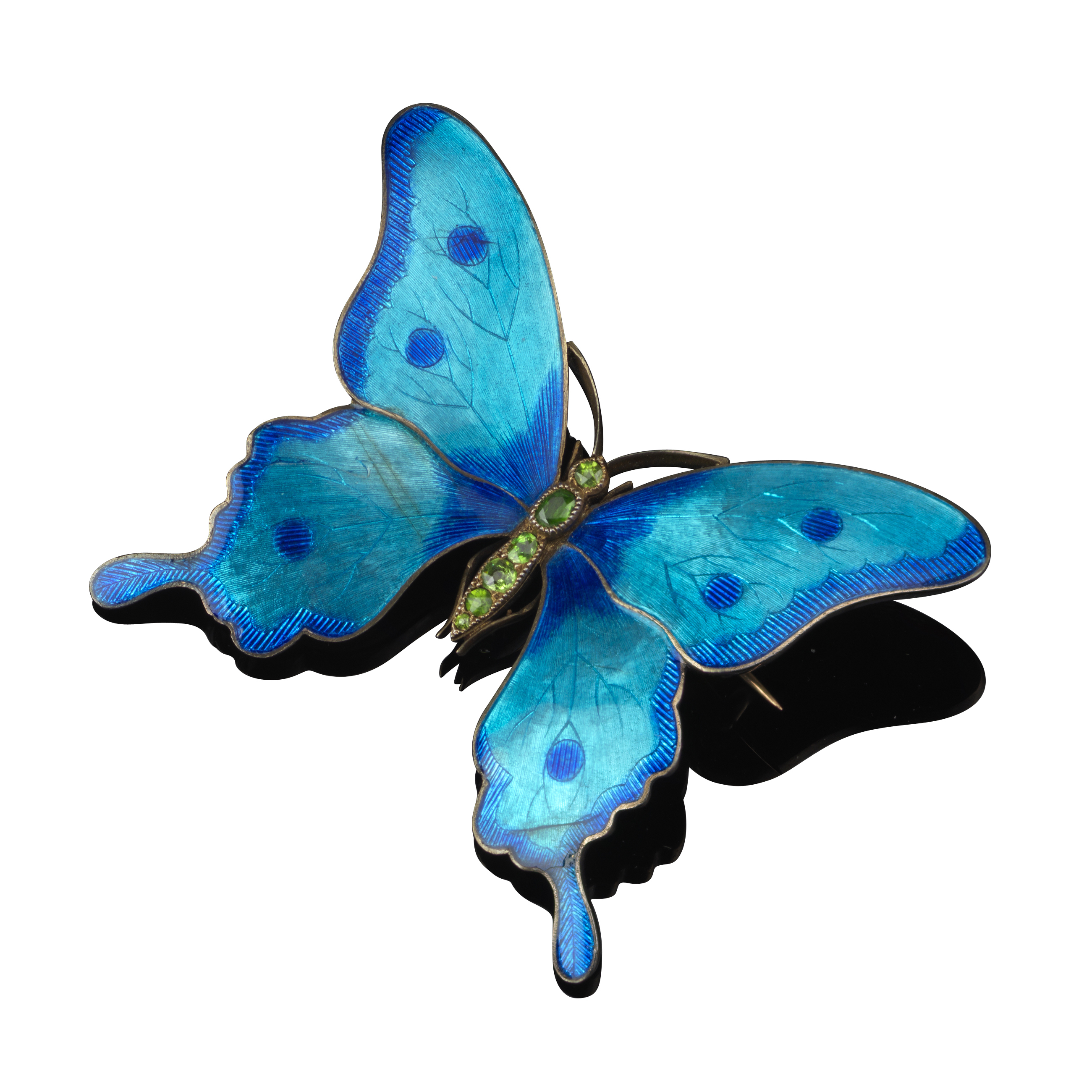 A silver gilt and blue enamel butterfly brooch by Child & Child, c1905, the wings finely engraved with veins and decorated with shaded blue enamel (fine hairline cracks) the body set with demantoid garnets, maker's mark to reverse, 6cm wide, fitted Child & Child case