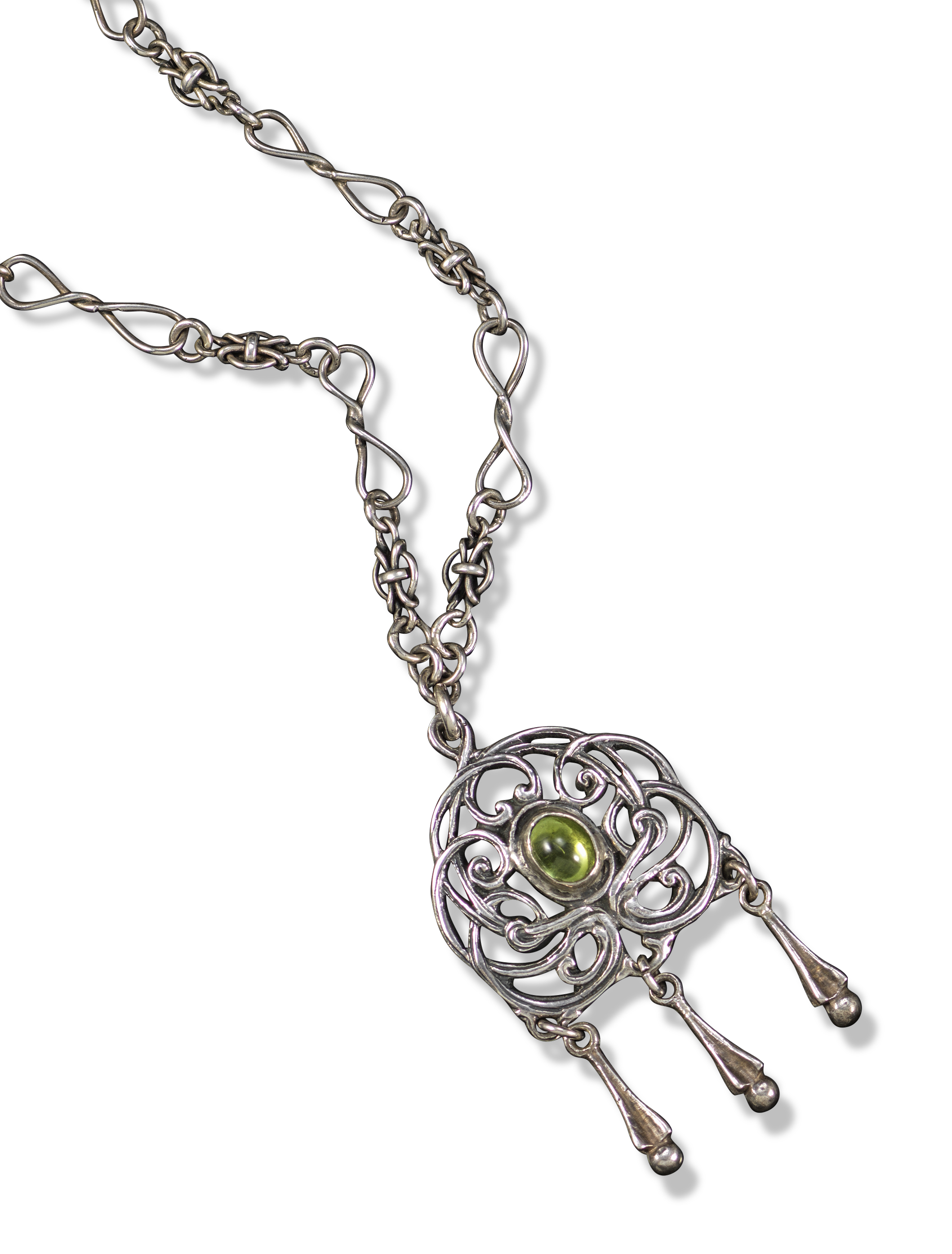 An Arts & Crafts silver pendant by Ramsden & Carr, of scrolling openwork design set with an oval green tourmaline cabochon with three elongated drops on a silver twisted link chain, London hallmarks for 1905, maker's mark, pendant 4.5cm high, chain 50cm long