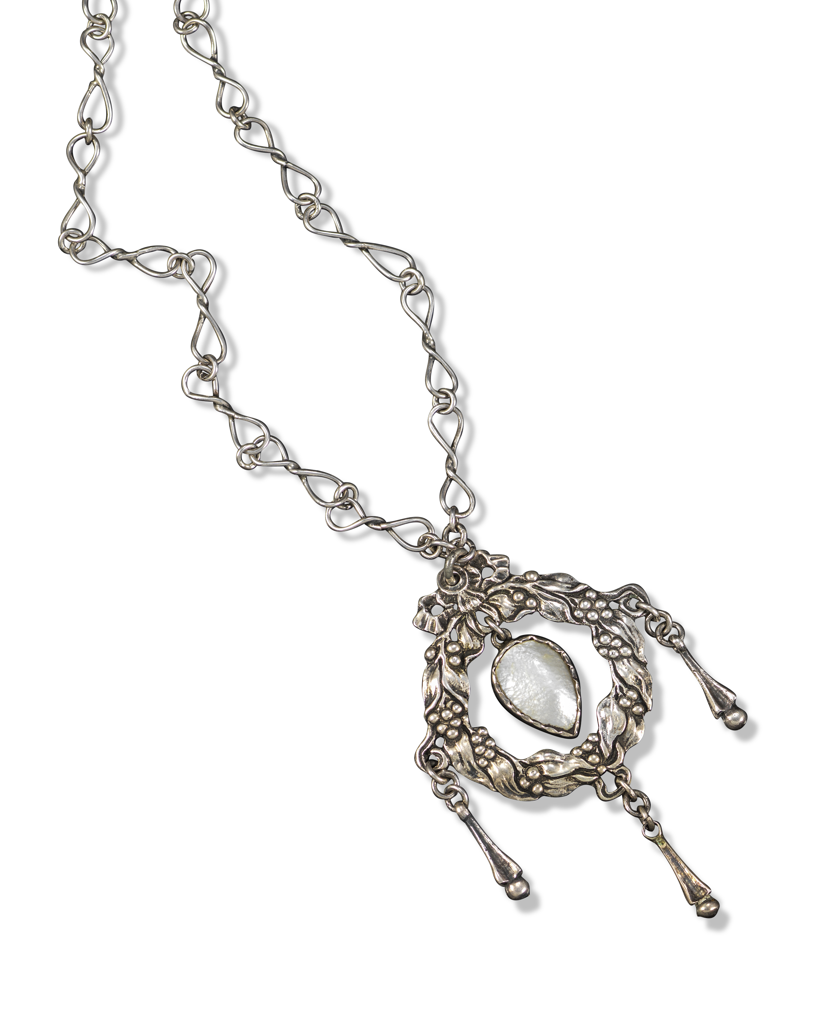 An Arts & Crafts silver pendant attributed to Ramsden & Carr, c1905, the wreath design centred with a pear-shaped mother of pearl and suspends three elongated silver drops on silver twisted-link necklace, pendant 6cm high, chain 40cm long