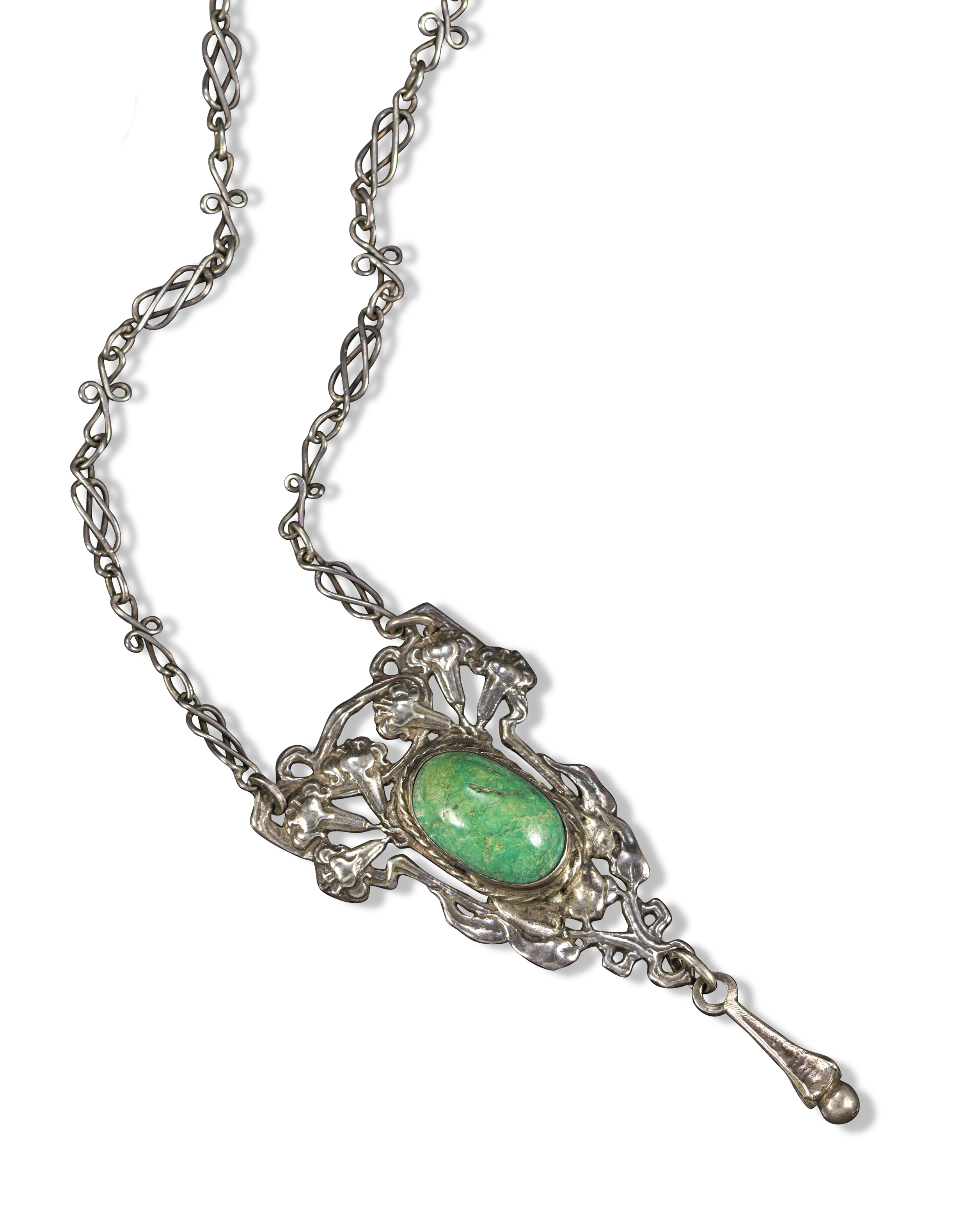 An Arts & Crafts silver pendant by Alwyn Carr, c1920, of naturalistic design and set with a turquoise cabochon, suspending an elongated silver drop, on twisted link silver chain, maker's mark to reverse, pendant 7cm, chain 42cm, case