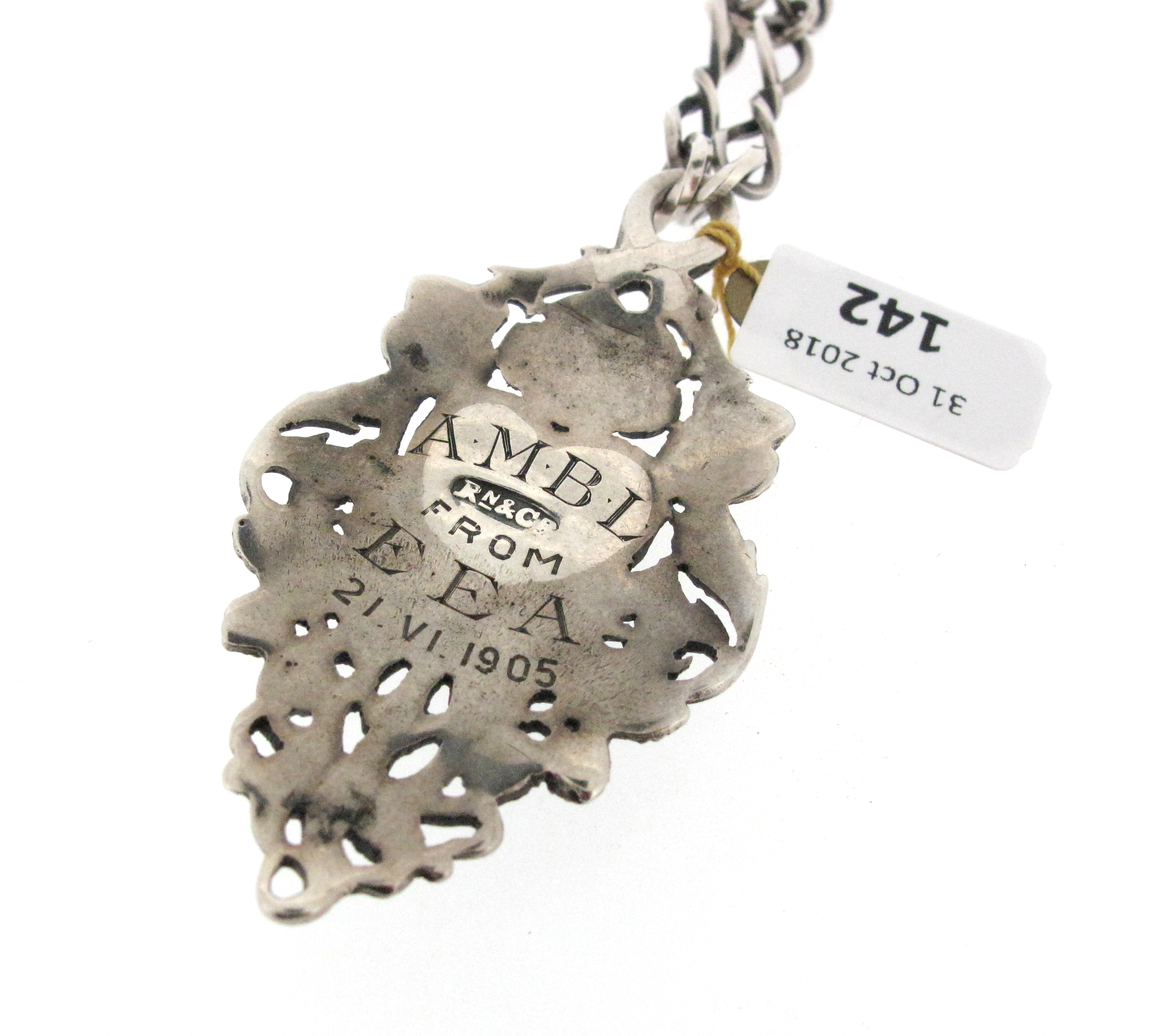 An Arts and Crafts silver and enamel pendant by Ramsden & Carr, centred with a red enamel heart beneath a Tudor rose and within silver thistle border, on silver twisted link chain, engraved to reverse 'A.M.B.L from E.E.A 21 VI 1905,' maker's mark, pendant 5.8cm high, chain 48cm long