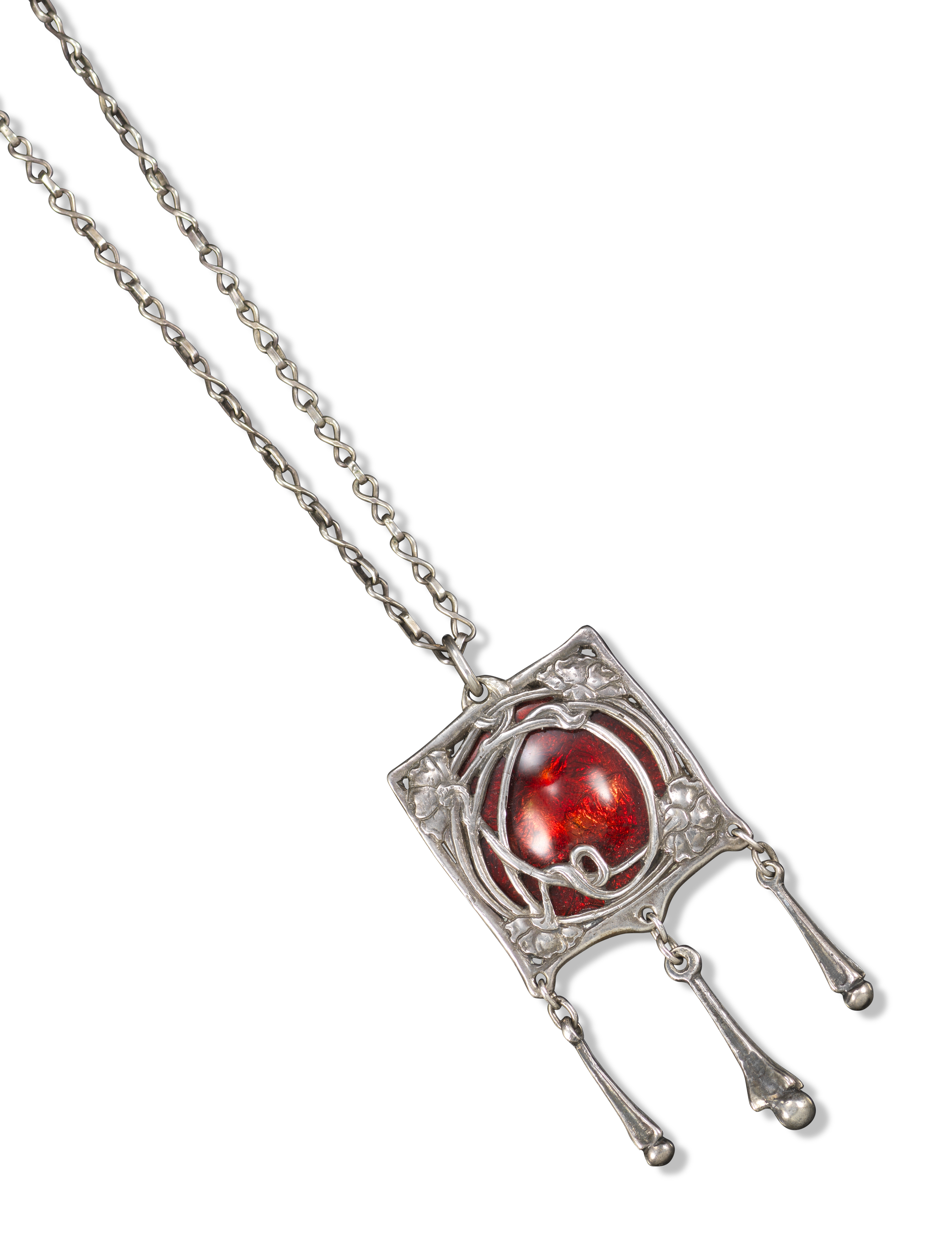 An Arts & Crafts silver pendant by Ramsden & Carr, c1905, the rectangular plaque with red enamel ground and decorated twisted floral motifs, suspending three elongated silver drops, on silver chain (possibly later), blue counter enamel, pendant 6.5cm long, chain 48cm long, Didier case