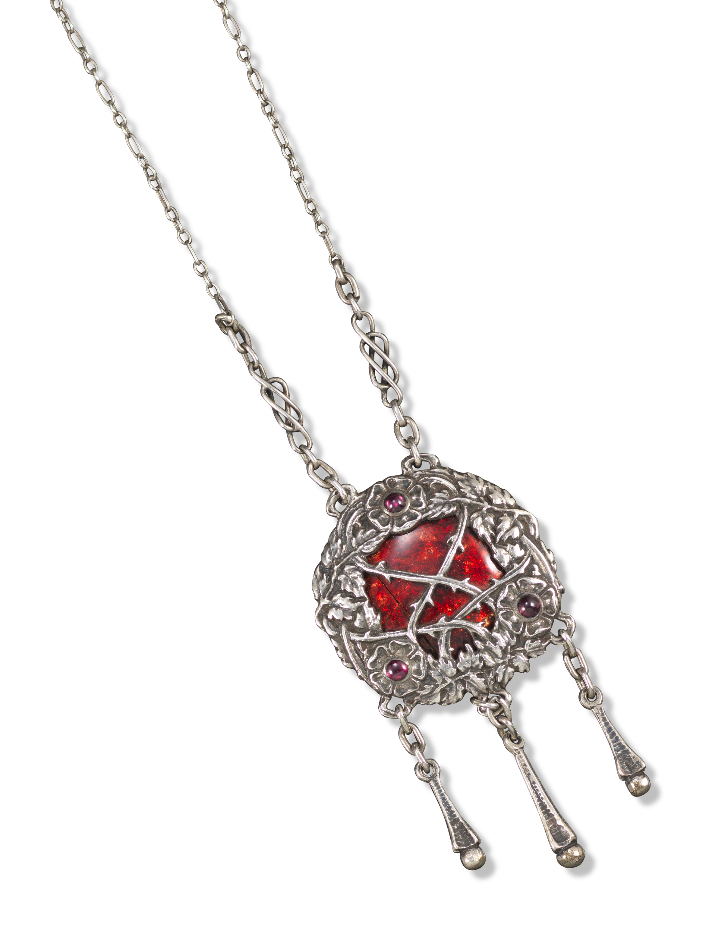 An Arts & Crafts silver and enamel pendant attributed to Ramsden & Carr, c1905, the circular pendant with red enamel ground (cracked), decorated with tendrils and three flowerheads each set with a garnet cabochon, suspending three elongated silver drops, on twisted link silver chain, pendant 6cm high, chain 50cm long