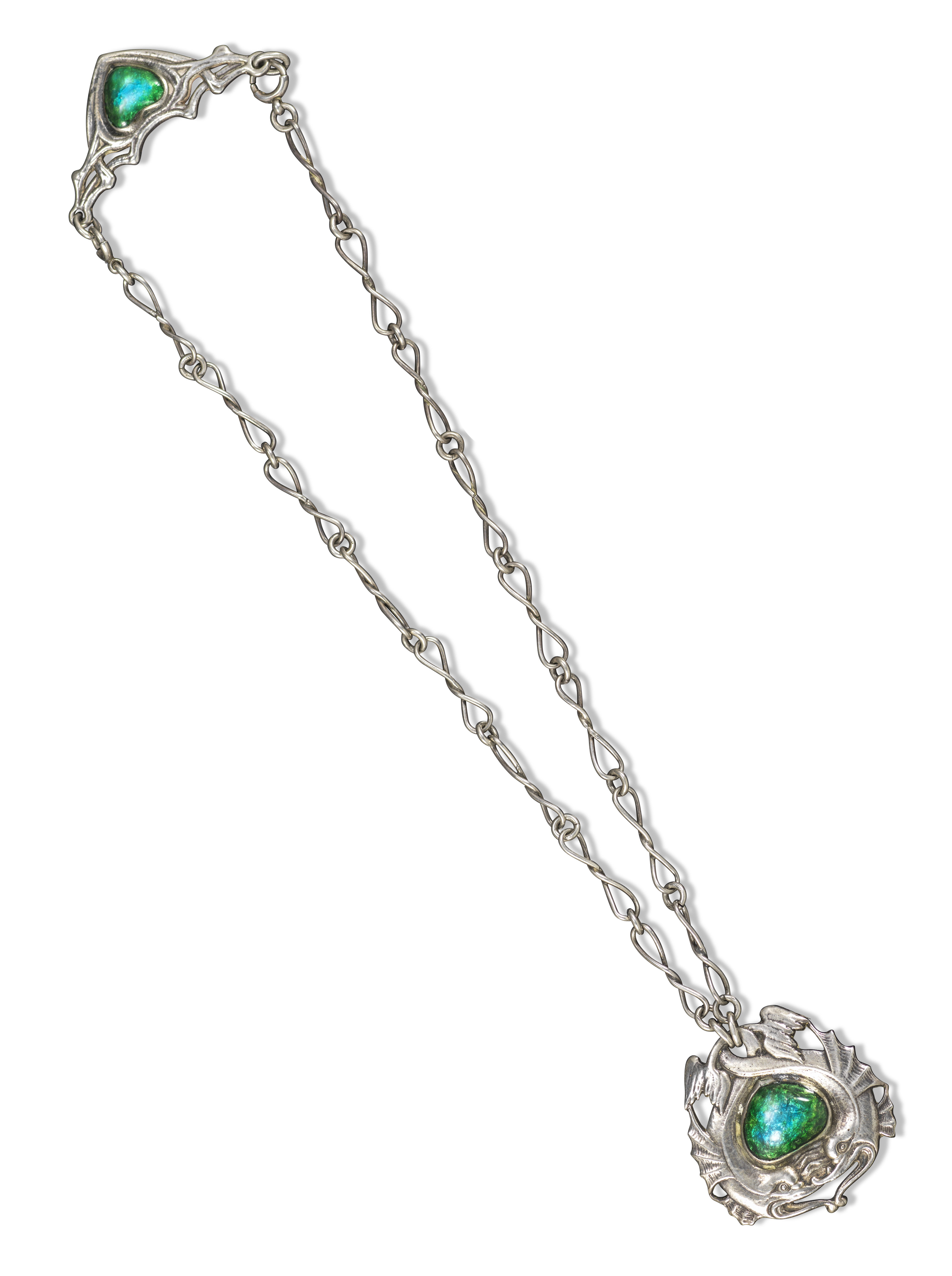 An Arts & Crafts silver necklace by Ramsden & Carr, designed as two intertwined silver sea monsters with a central green enamel plaque, on silver twisted-link chain and a shield-shaped silver and enamel back section, London hallmarks for 1904, maker's mark (repeated on back section), pendant 3.8cm high, chain 44cm long