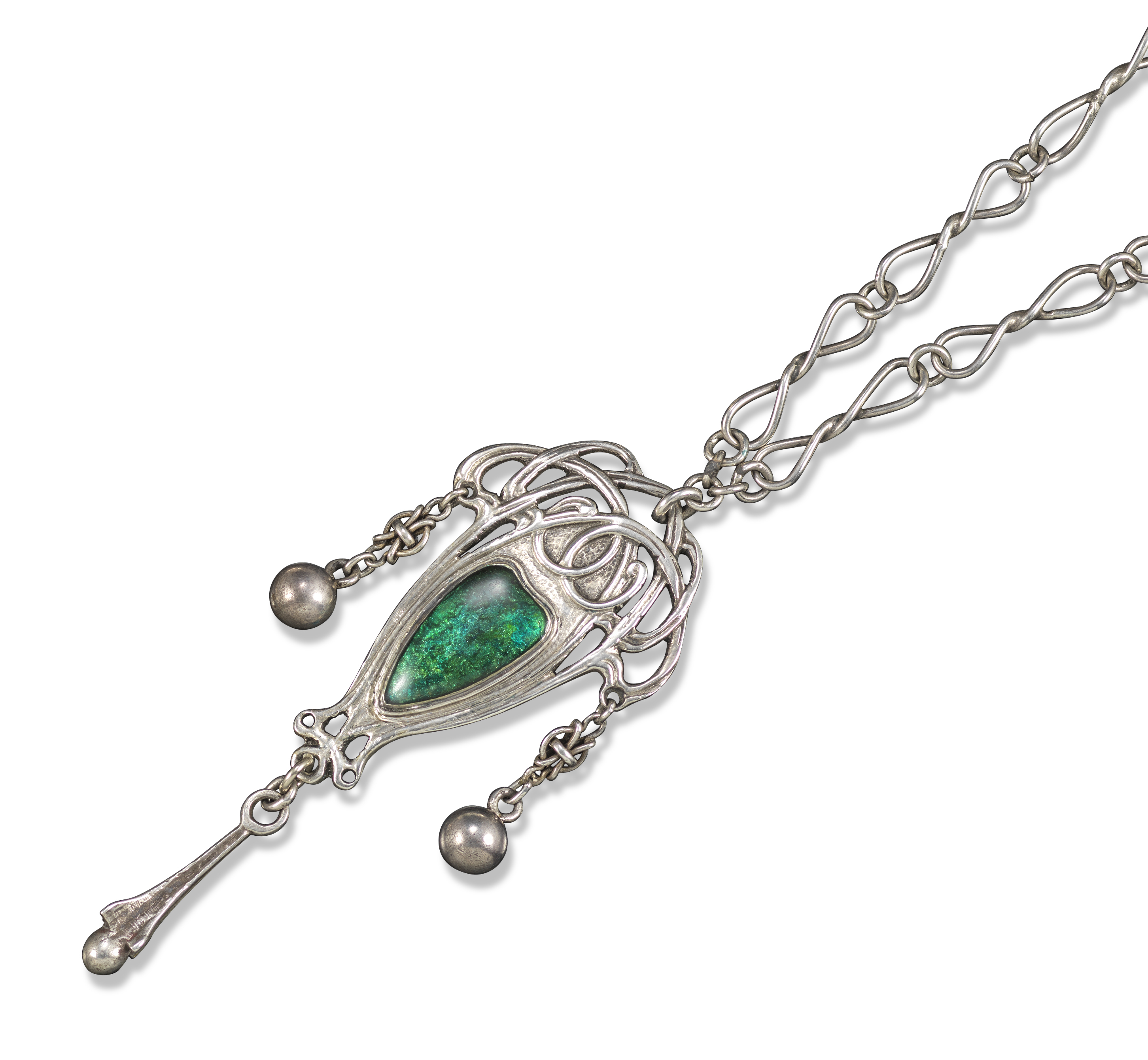 An Arts & Crafts silver and enamel pendant by Ramsden & Carr, the heart-shaped green plaque within silver scroll border suspending two silver spheres and an elongated silver drop, on twisted-link silver chain, London hallmarks for 1905, maker's mark, pendant 7.5cm long, chain 45cm long, Didier case