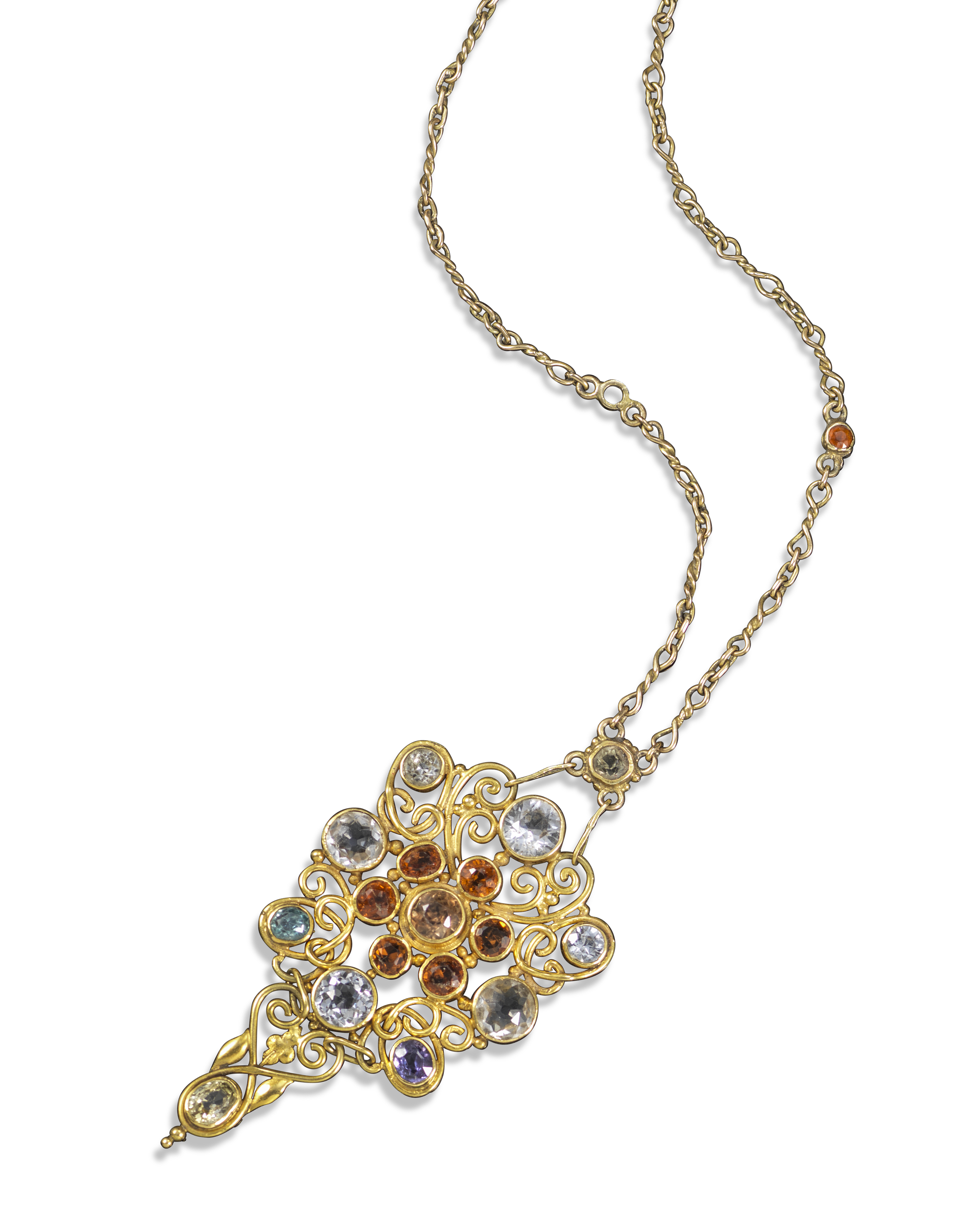 An Arts & Crafts gem-set gold pendant attributed to Omar Ramsden, c1925, set with zircons, hessonite garnets and sapphires in gold wirework surround, suspended from oval-link gold neck chain (one stone in chain missing), pendant 8cm long, chain 46cm long, original fitted Omar Ramsden case
