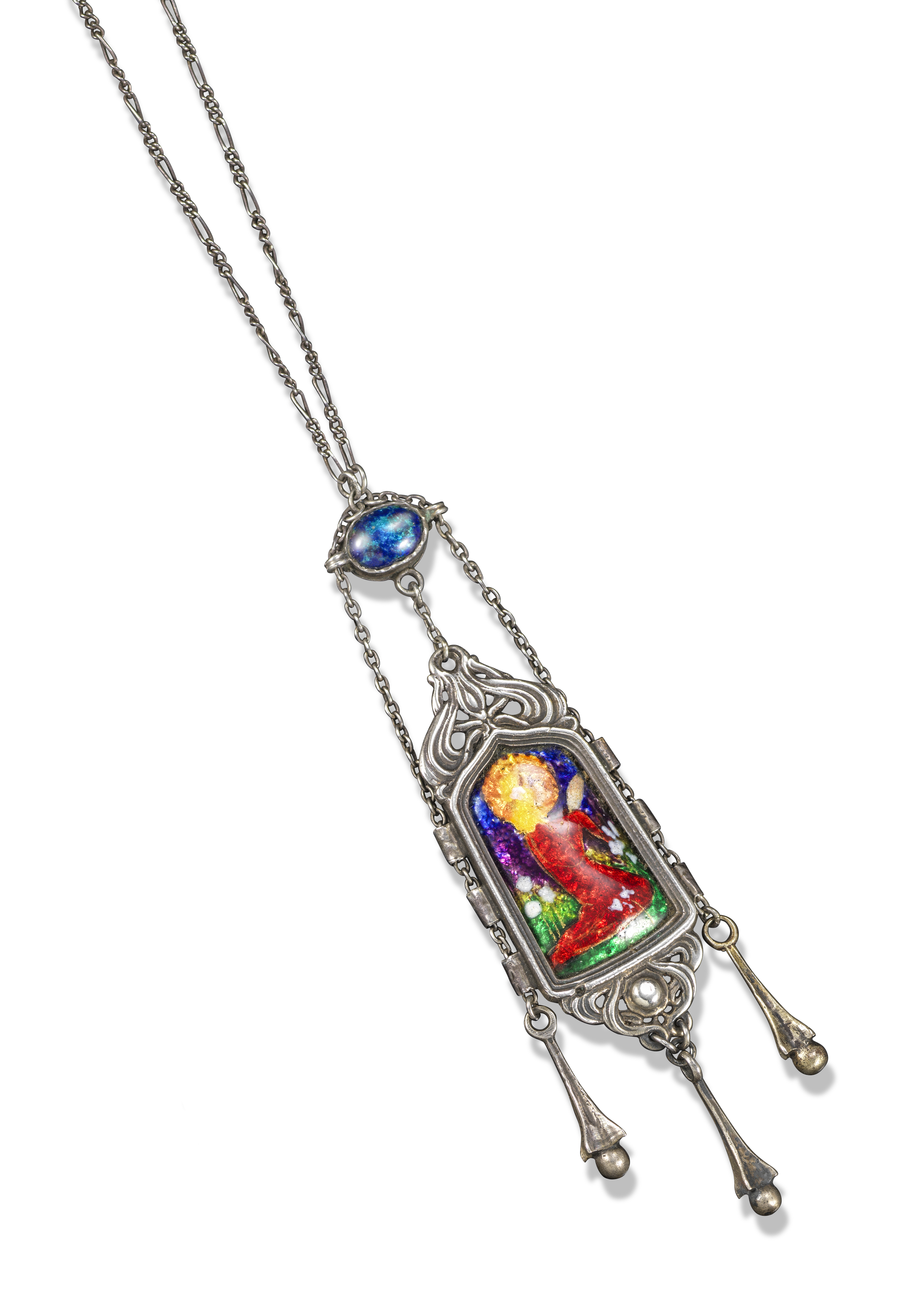 An Arts & Crafts silver and enamel pendant by Ramsden & Carr, the elongated pendant with central aperture mounted with a polychrome enamelled plaque of a kneeling figure in profile, her hands raised in supplication, with flowers and grass to the background, the sides of the frame with silver cylindrical sleeves to suspend an oval-link chain with elongated cusp drops, enamel upper section and fetter link necklace, London hallmarks for 1905, maker's mark, pendant 11cm high, chain 47cm long, case