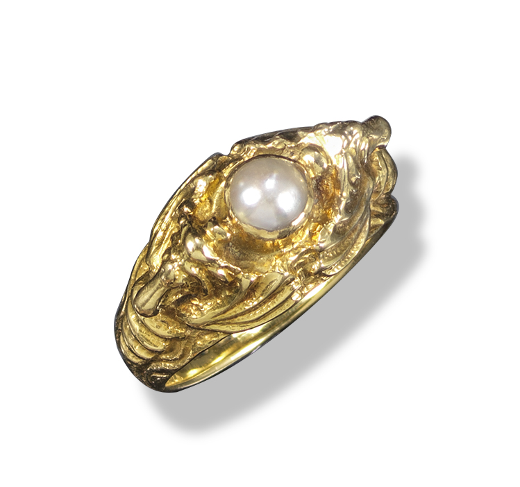 A gold ring by Omar Ramsden, centred with a half pearl within intertwined embossed seahorses, engraved to interior 14 July 1933 and OMAR RAMSDEN ME FECIT, London hallmarks for 1933, maker's mark, size M