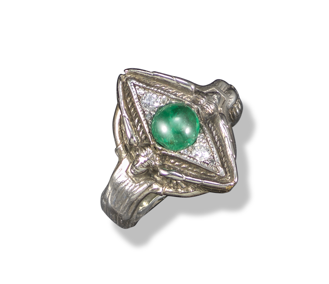 A lozenge-shaped white gold ring by Omar Ramsden, c1925, set with an emerald cabochon and two diamonds within white gold lozenge border held on the outstretched arms of two winged deities, their legs extending to form the architectural-style hoop with scroll embossed back, polished inner plate engraved 'OMAR RAMSDEN ME FECIT', size N