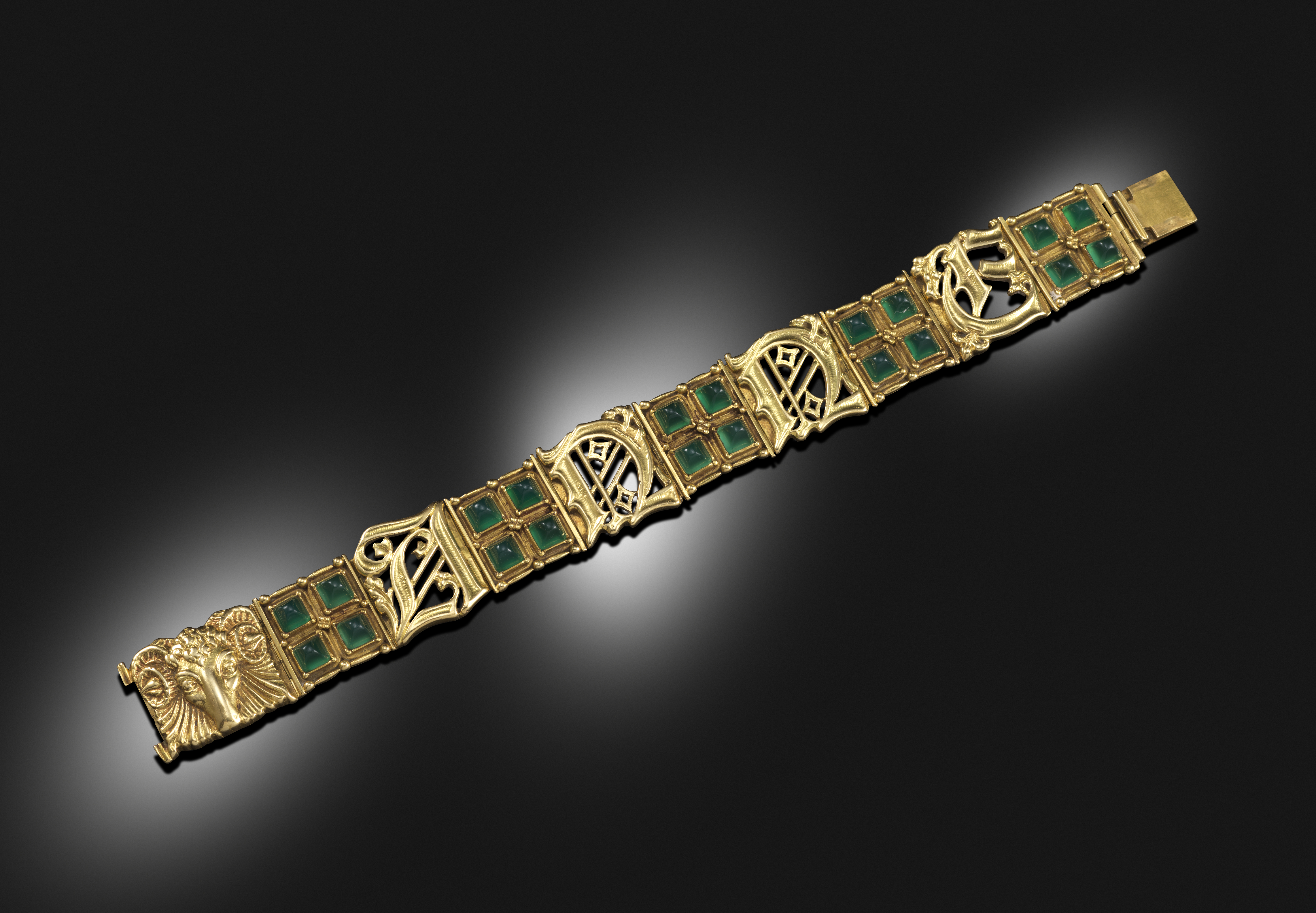 A gold bracelet by Omar Ramsden, composed of four uniform square plaques, each set with four conical chrysoprase cabochons in beaded borders, each plaque separated by a Gothic script letter spelling out the name ANNE, the clasp embossed with the head of a ram in fluted frame, London hallmarks for 1931, maker's mark and engraved OMAR RAMSDEN ME FECIT MCMXXXI, 19.5cm long, 65.5g