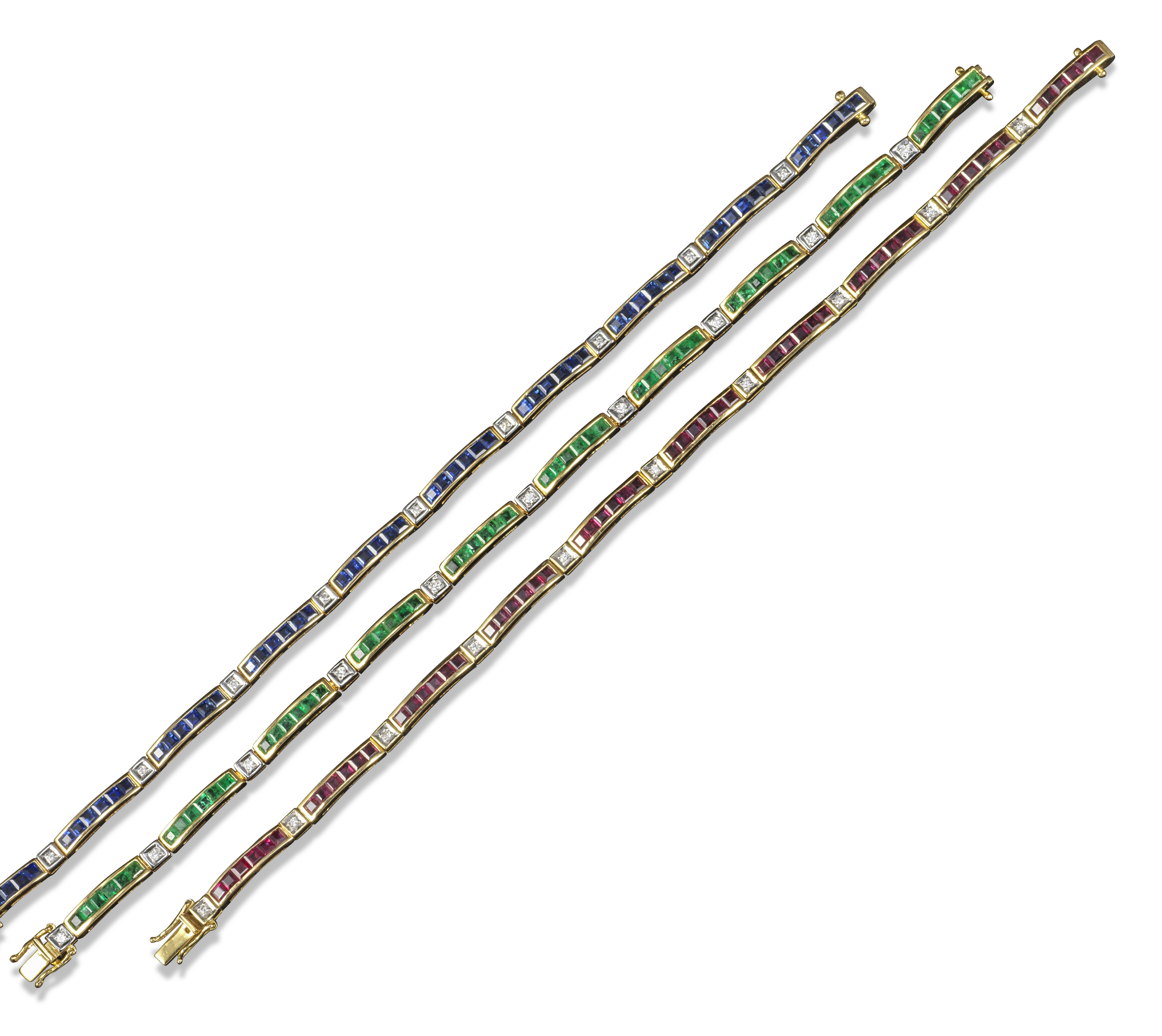 Three similar yellow gold line bracelets, one with square-shaped sapphires separated with diamonds, another with rubies and diamonds and the other with emeralds and diamonds, each 19cm