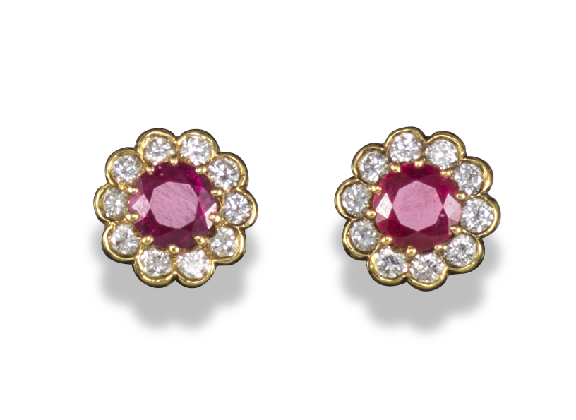 A pair of ruby and diamond stud earrings, the circular-cut rubies are set within a surround of small circular-cut diamonds in yellow gold