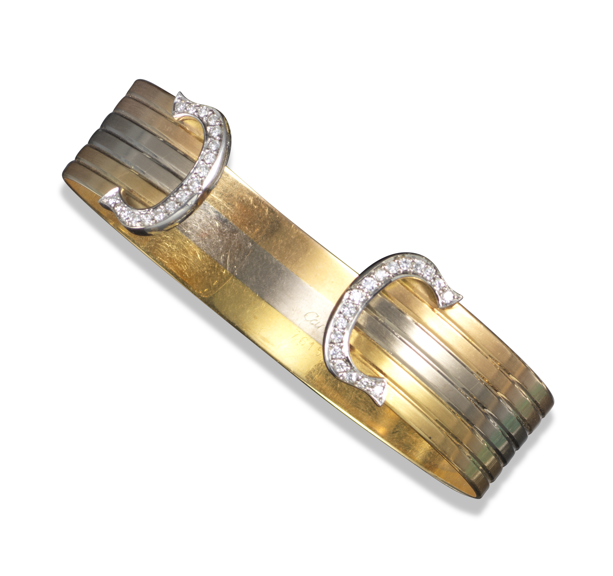 A three colour gold open bangle by Cartier, the striated bangle with diamond-set 'C' terminals, signed Cartier 750, 761597, model no. 60077326, 32g