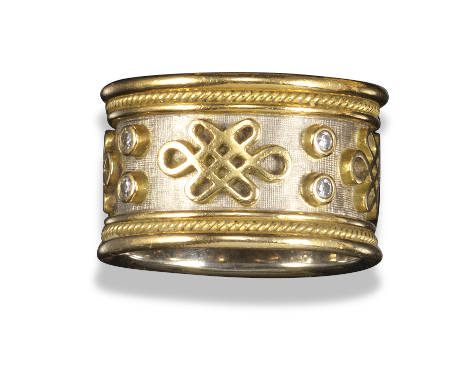 An 18ct yellow and white gold Templar ring by Elizabeth Gage, applied with knot motifs and each separated by a pair of round brilliant-cut diamonds, twisted rope borders, signed with monogram, maker's initials and GAGE, size approximately S, Elizabeth Gage box
