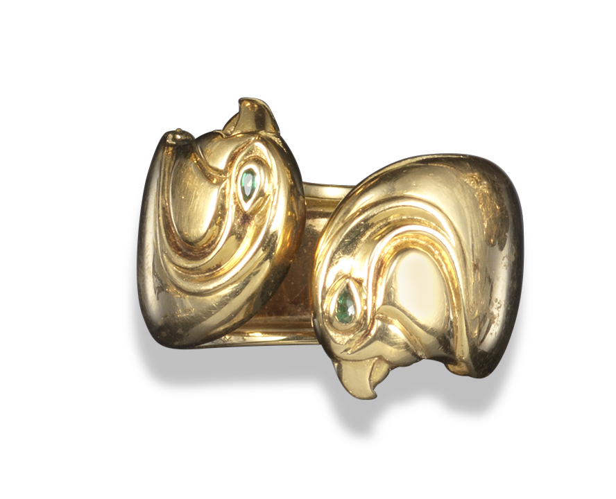 An 18ct yellow gold open wide ring by Cartier, the falcon head terminals each set with a pear-shaped emerald eye, London marks for 1989 and maker's mark JC, inventory no. R7513 and 52, size approximately M, Cartier box
