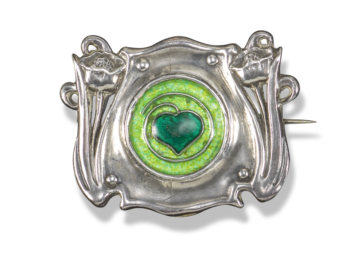 An Arts & Crafts silver brooch by Nelson Dawson, c1900, the centre enamelled with two-colour green heart and tendril motif in silver frame with embossed silver flowers, scratched ND to reverse, 3.5cm wide