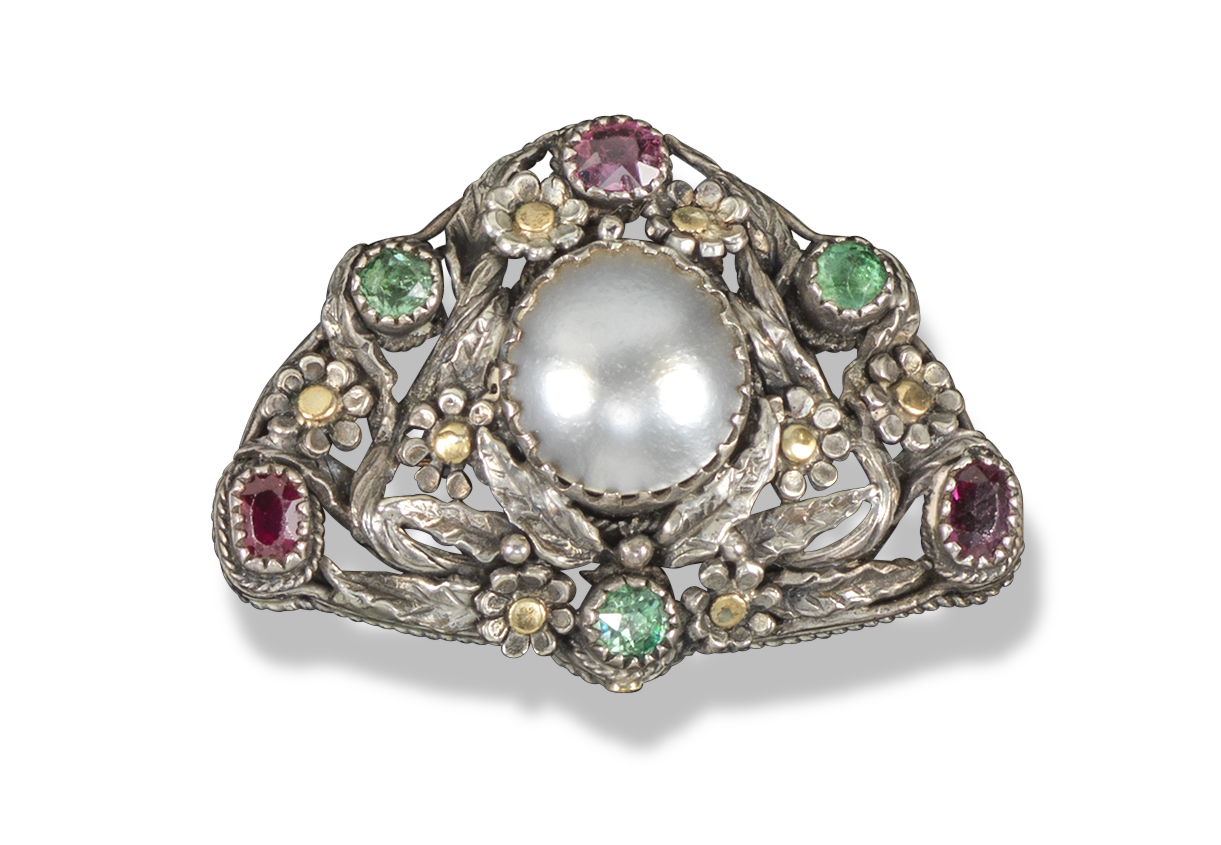 An Arts & Crafts silver and gem-set brooch, c1900, possibly attributed to The Artificers Guild, set with a central blister pearl within foliate surround set with rubies and emeralds, 3.4cm wide, fitted case by Tadema Gallery