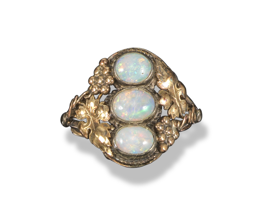 An opal three stone ring, possibly attributed to Edward Spencer, c1905, mounted with three oval opals in vine tendrils and grape cluster frame, size M