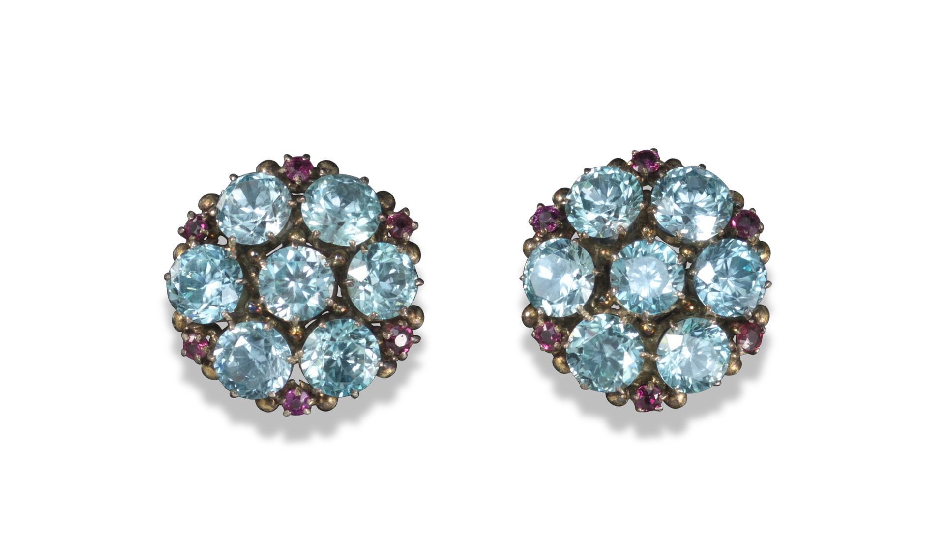 A pair of silver, blue zircon and ruby cluster ear studs attributed to Dorrie Nossiter, c1930, each set with seven blue zircons and six rubies in silver, 2.1cm wide, fitted case