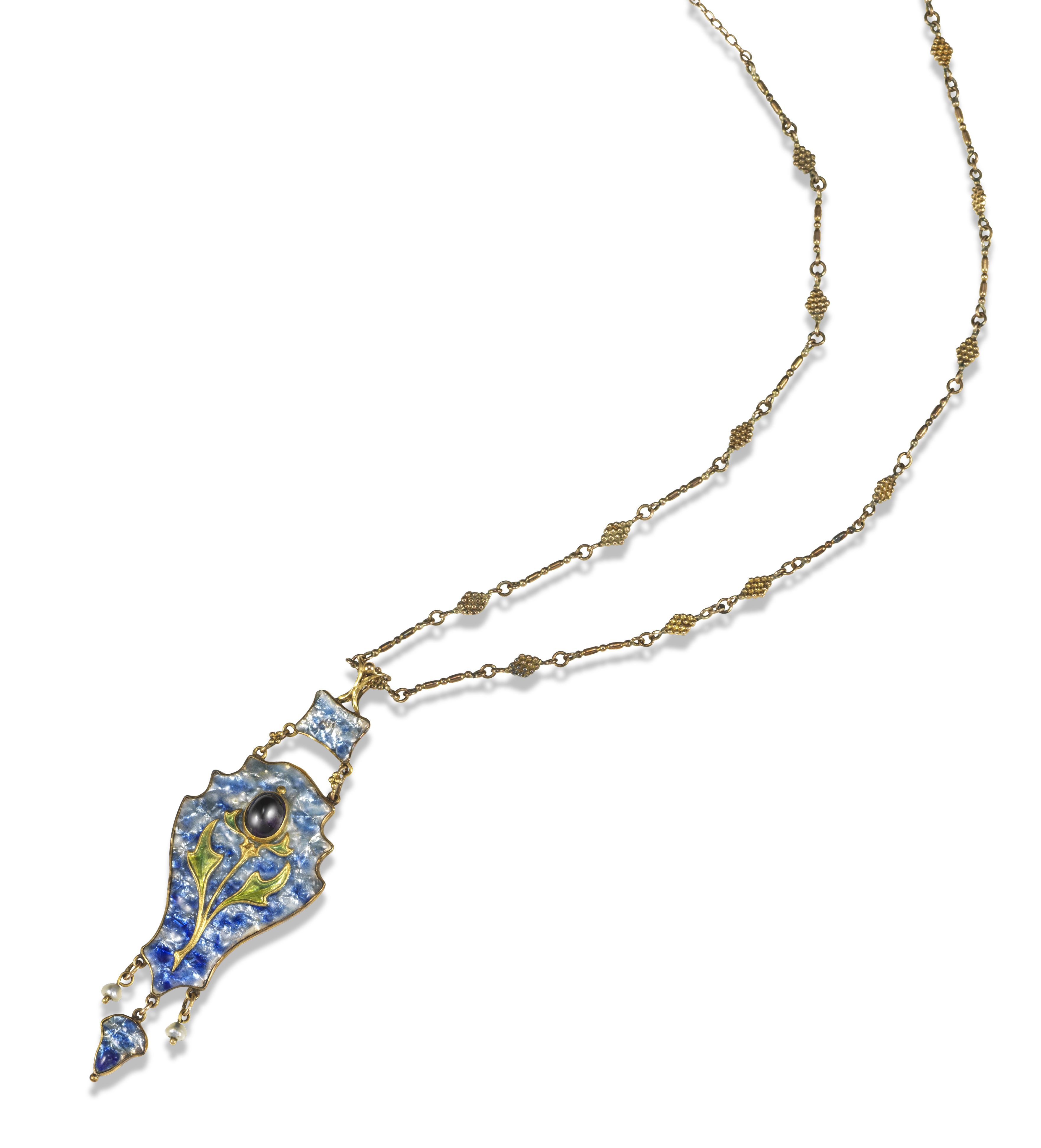 An Arts & Crafts Scottish gold pendant by James Cromar Watt, c1905, decorated with blue and iridescent white enamel with a stylized thistle set with an amethyst cabochon, on fancy-link neck chain, signed to reverse with initials, pendant 7cm long, chain 42cm long, fitted case by Tadema