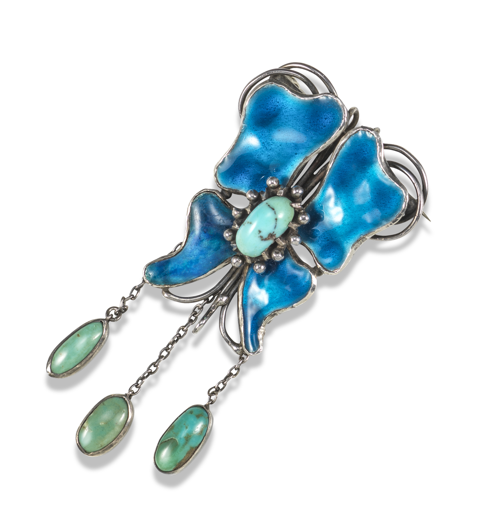 An Arts & Crafts silver enamel and turquoise brooch attributed to C.R.Ashbee for The Guild of Handicraft, c1900, the four petal flower decorated with translucent blue enamel set with a central turquoise cabochon matrix in beaded border, suspending three lines of silver chain with turquoise finials, silver tendril decoration, 7.2cm high