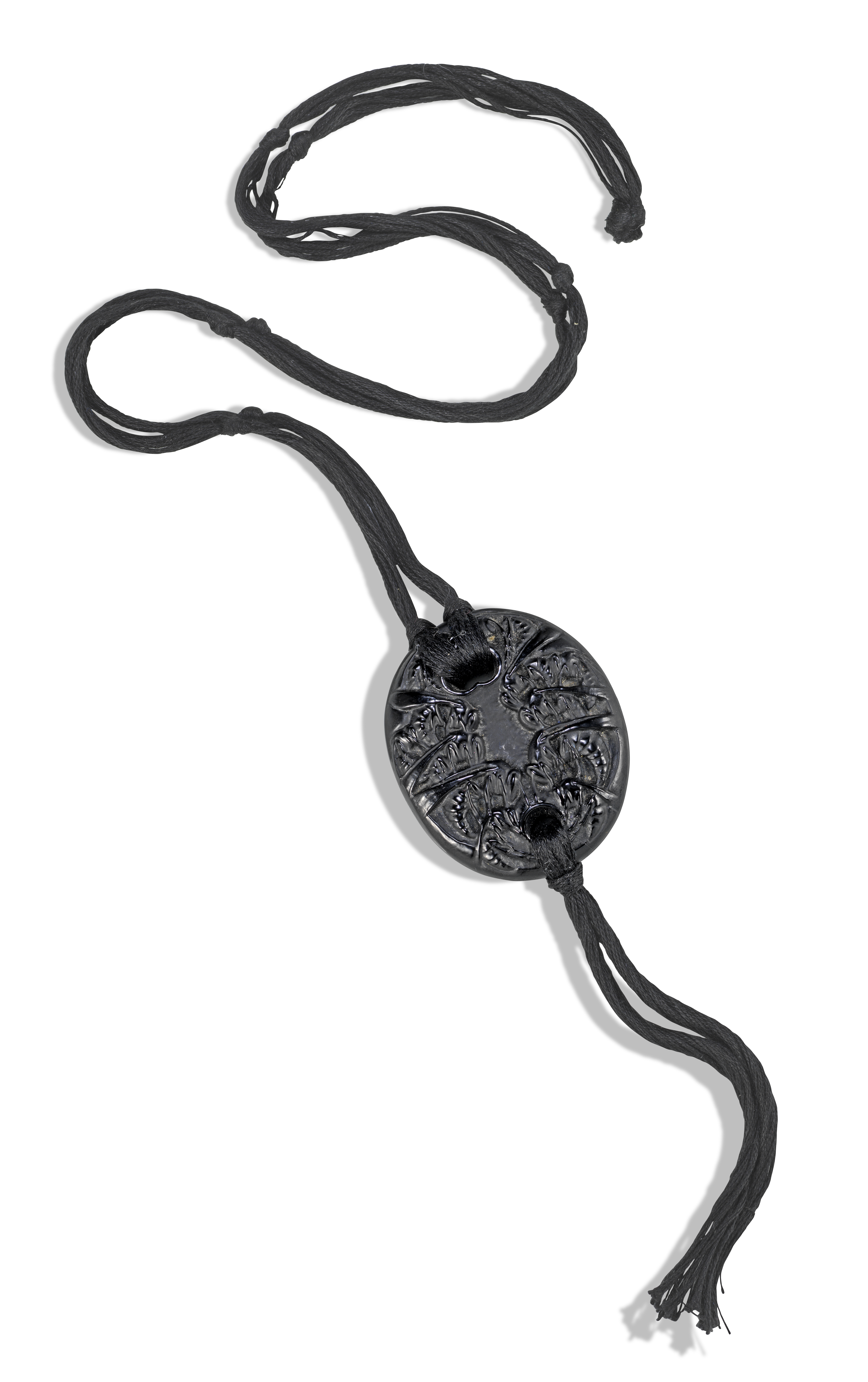 `'Guepes' no.1650, a Lalique black glass pendant by designed by René Lalique, the moulded glass depicting stylised wasps bearing two apertures for the black silk cord, engraved R Lalique to reverse, the pendant 5.6cm long