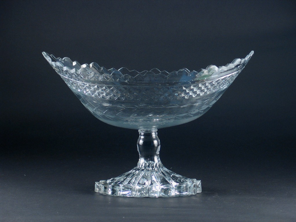 An Irish cut glass oval bowl, with a shaped rim and flared moulded foot. Both with s mall rim chips. Late 18th century, 34cm. Together with a circular glass dish. (2)