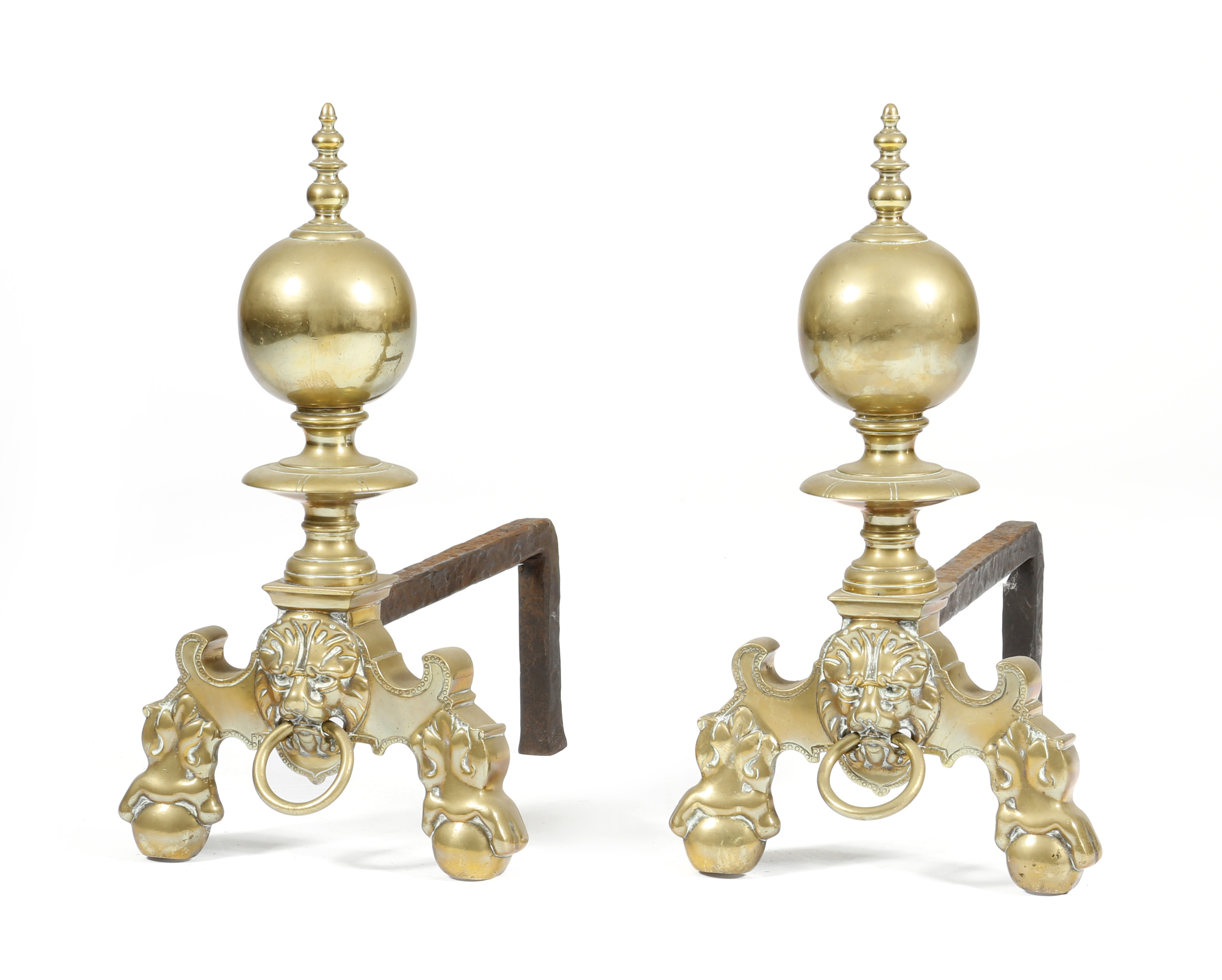A pair of Dutch brass andirons, with turned ball finials, above lion's masks, on claw and ball feet, with iron supports, 19th century, 46cm high, 26.6cm wide, 39.5cm deep. (2)