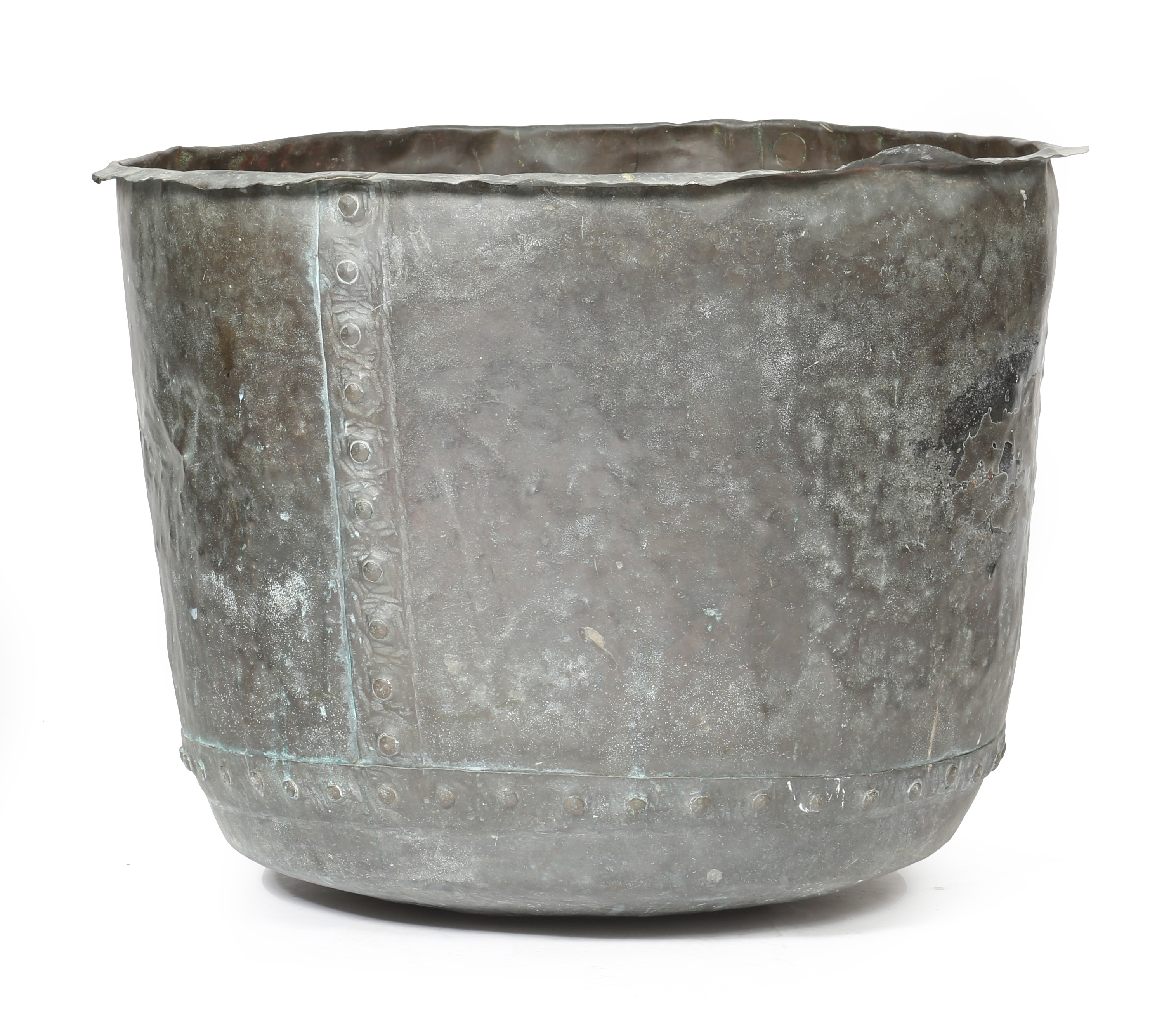 A large copper logbin, with a riveted body, 55.3cm high, 73cm diameter.