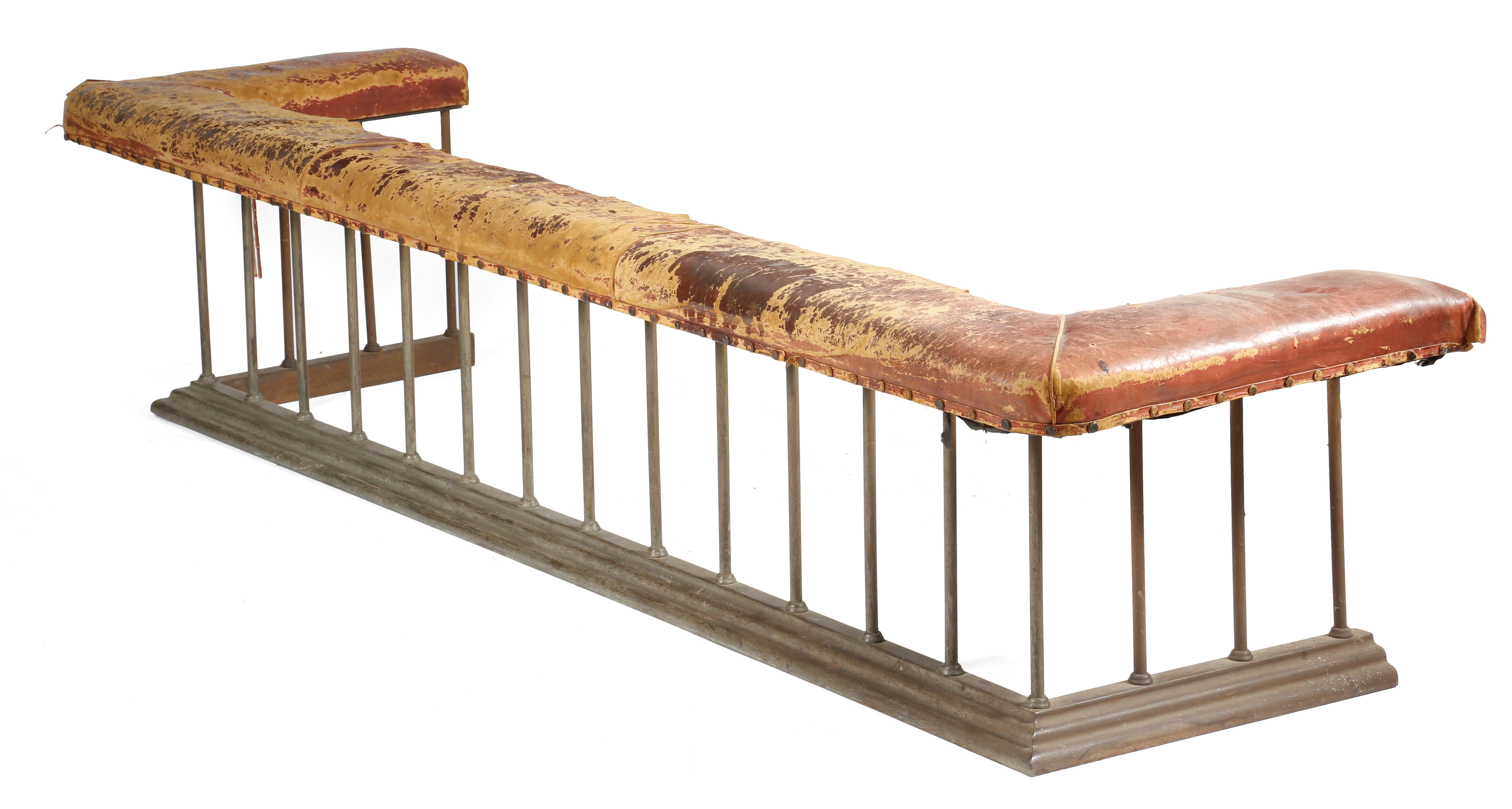 A large country house club fender, with a leather seat on a metal frame, late 19th / early 20th century, 50.3cm high, 240cm wide, 66cm deep.