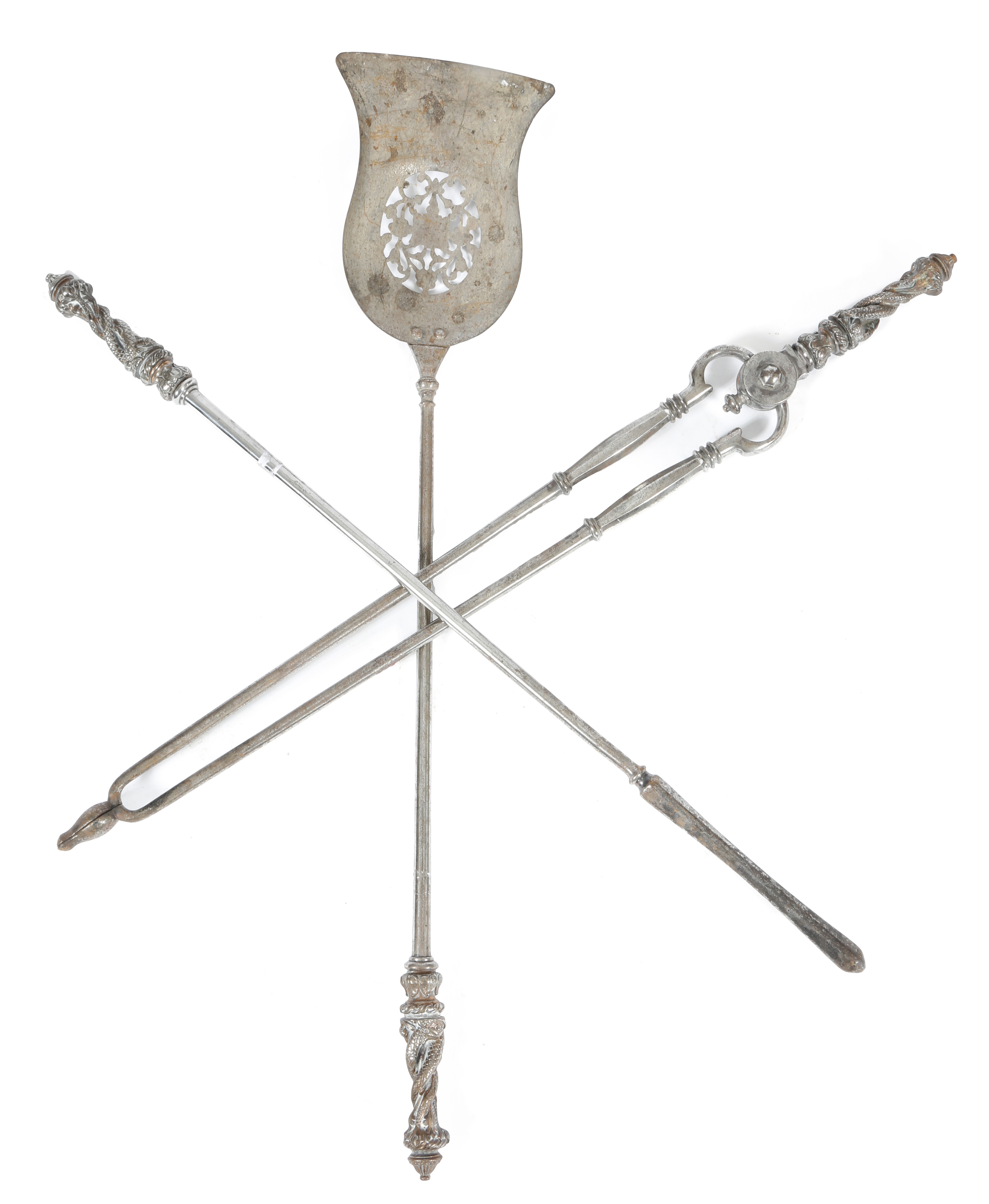 A set of William IV steel fire irons, with entwined dolphin and leaf handles and with a pierced pan, 78.7cm long (max). (3)