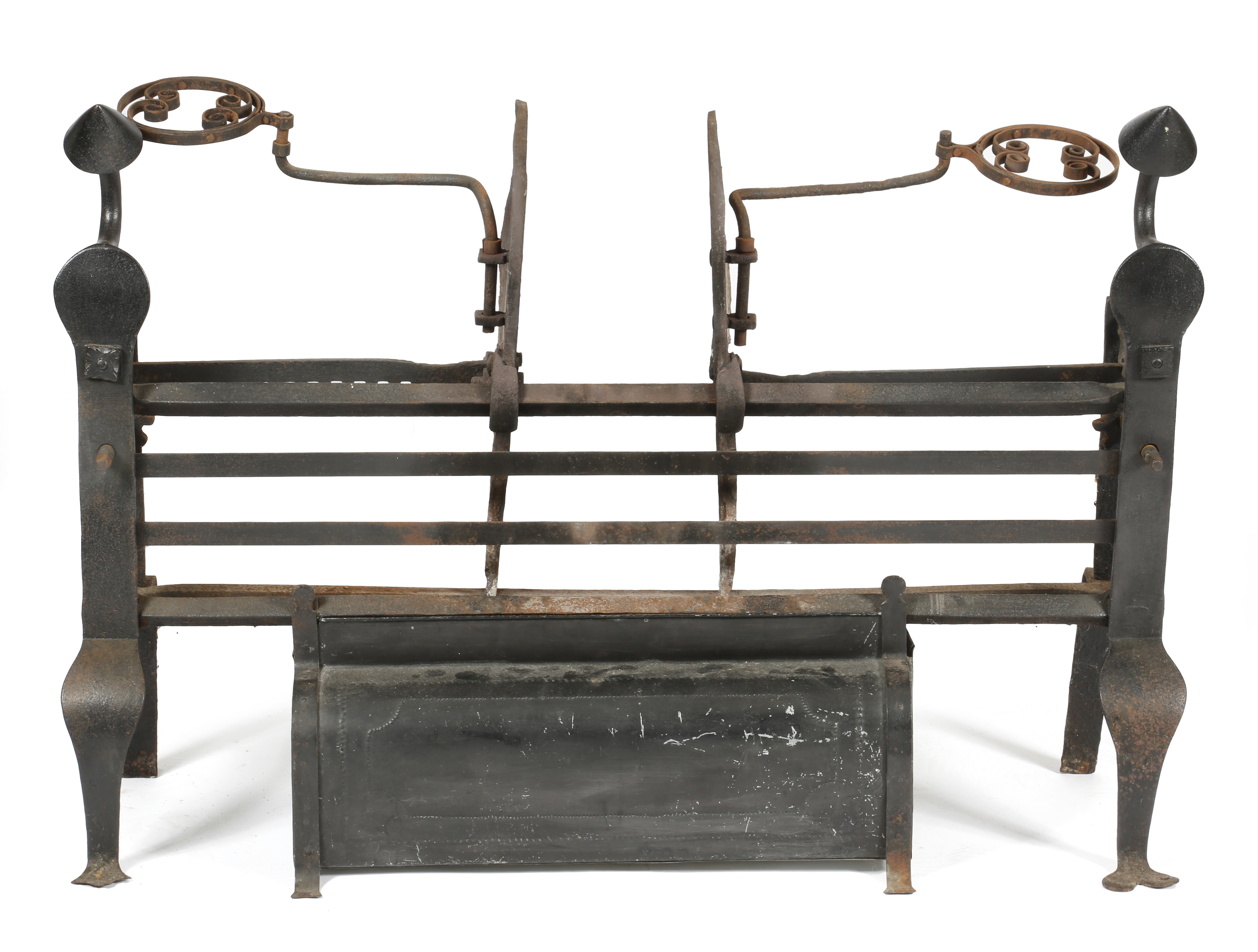 An 18th century cast iron fire-grate, with a railed front and with adjustable pot hook arms, on front cabriole legs, with a separate basket, 78.5cm high, 113.5cm wide, 31.5cm deep.