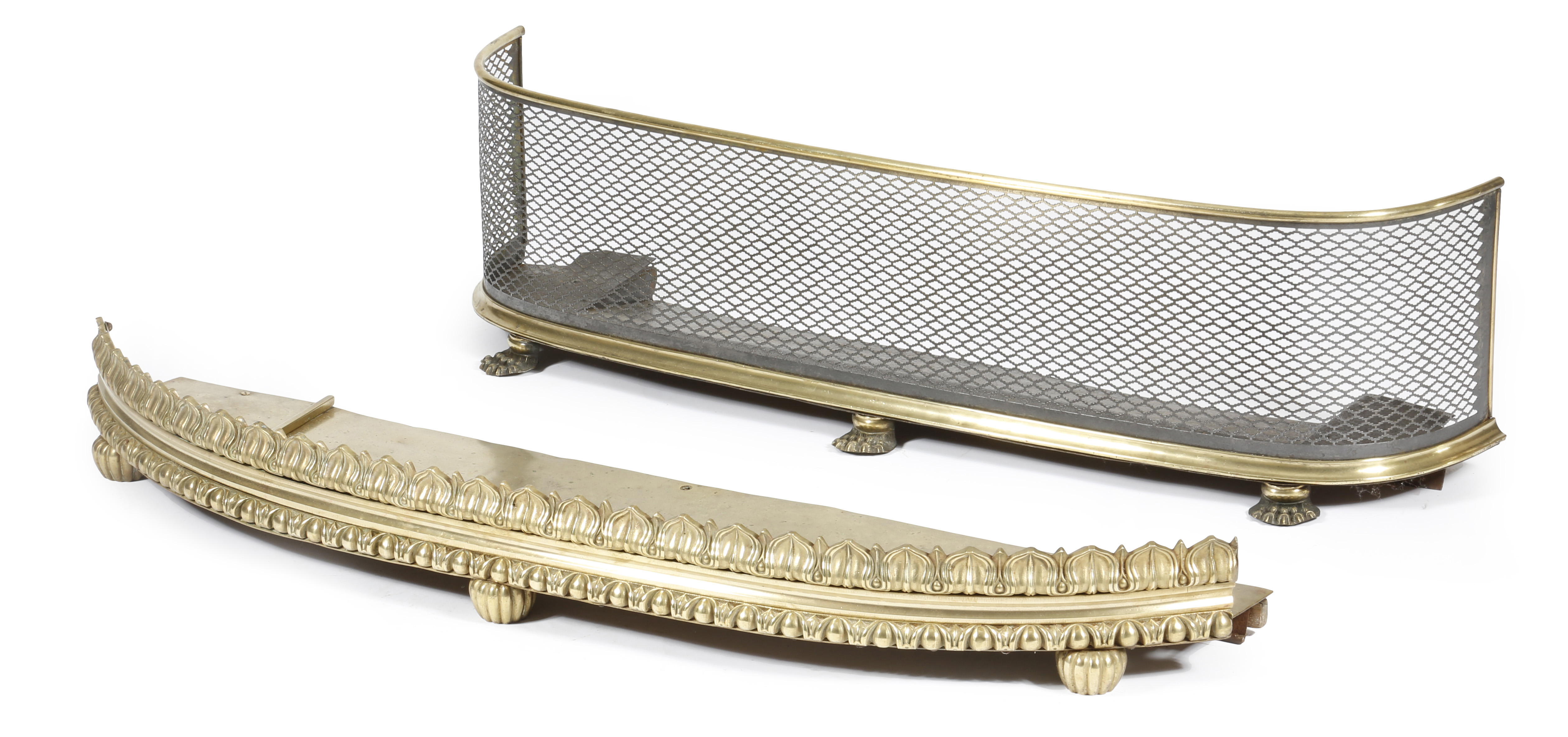 A William IV gilt brass or bronze bowfront fender, with a band of lappet decoration above an ovolo moulding and on ribbed bun feet, 111.5cm wide, together with a brass bowfront fender, with a mesh guard and on paw feet, 101cm wide. (2)