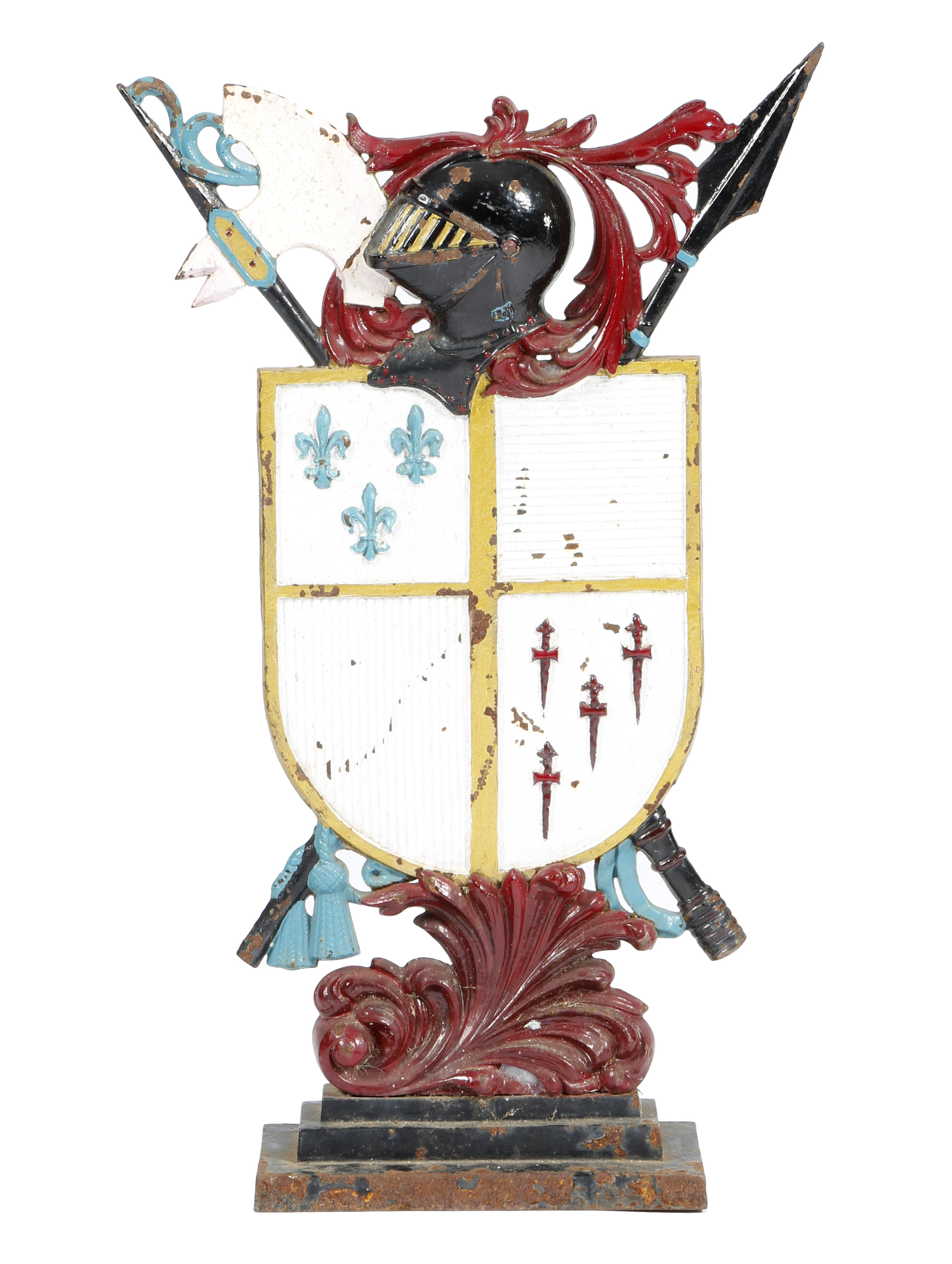 A late Victorian painted cast iron doorstop, in the form of a coat of arms, with a helm and leaf surmount and a crossed halberd and spear, the back with a registration number 'RD 776857' and 'No. 552', 63.2cm high, 37.8cm wide.