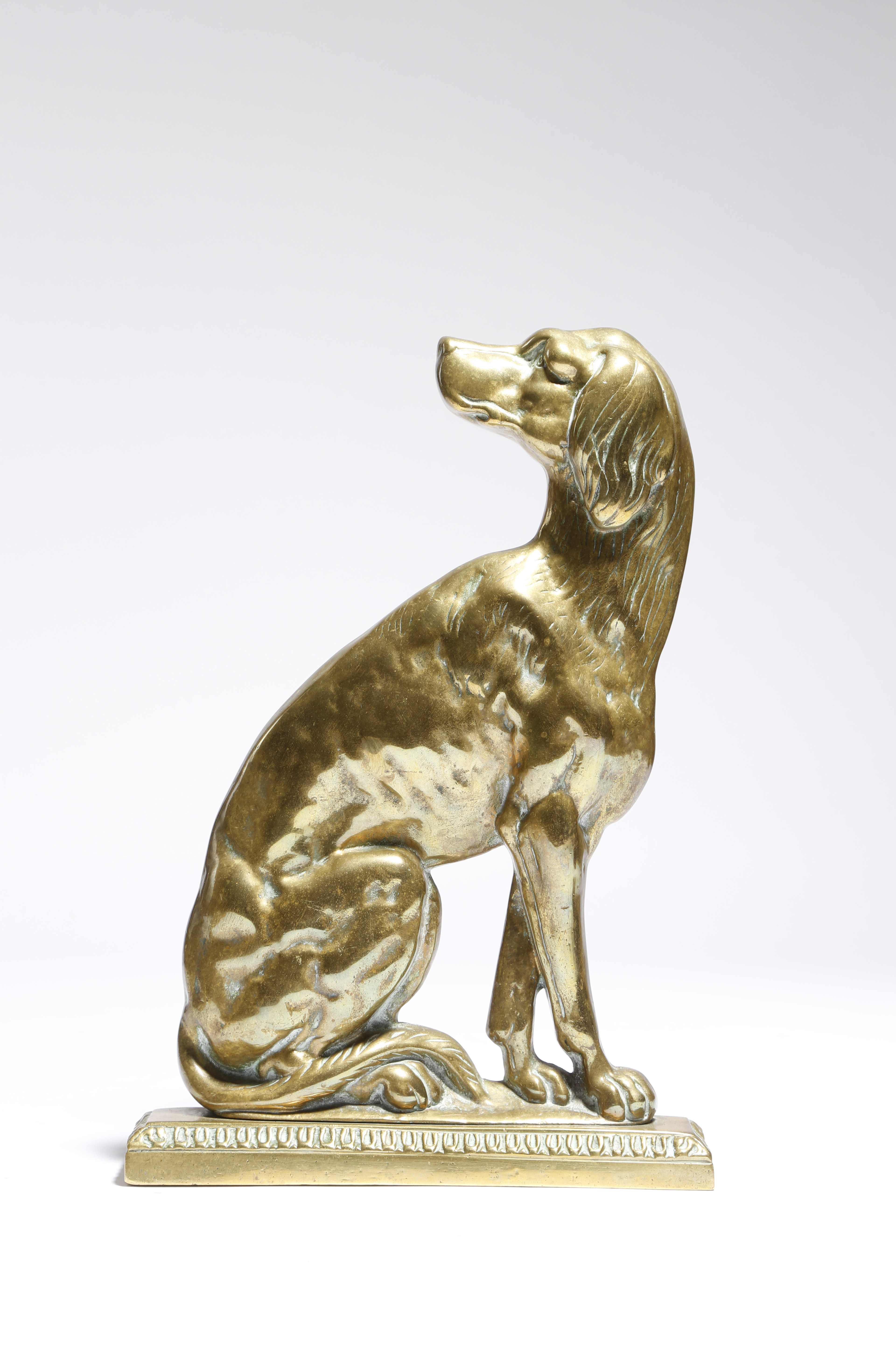 A Victorian brass doorstop, in the form of a seated dog, with a registration lozenge and numbered '19', 33cm high.