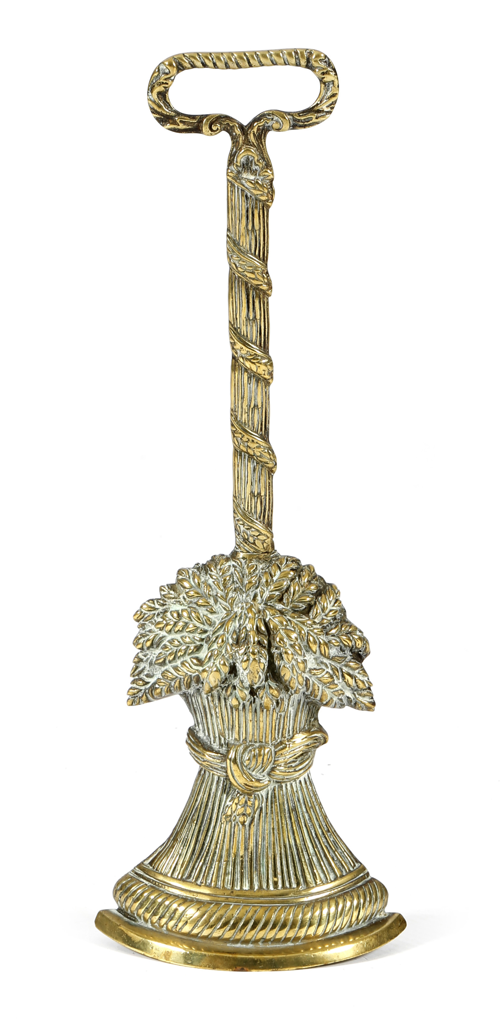 A 19th century brass wheatsheaf doorstop, with an open handle, on a reeded leaf decorated stem and a weighted base, 40.9cm high.