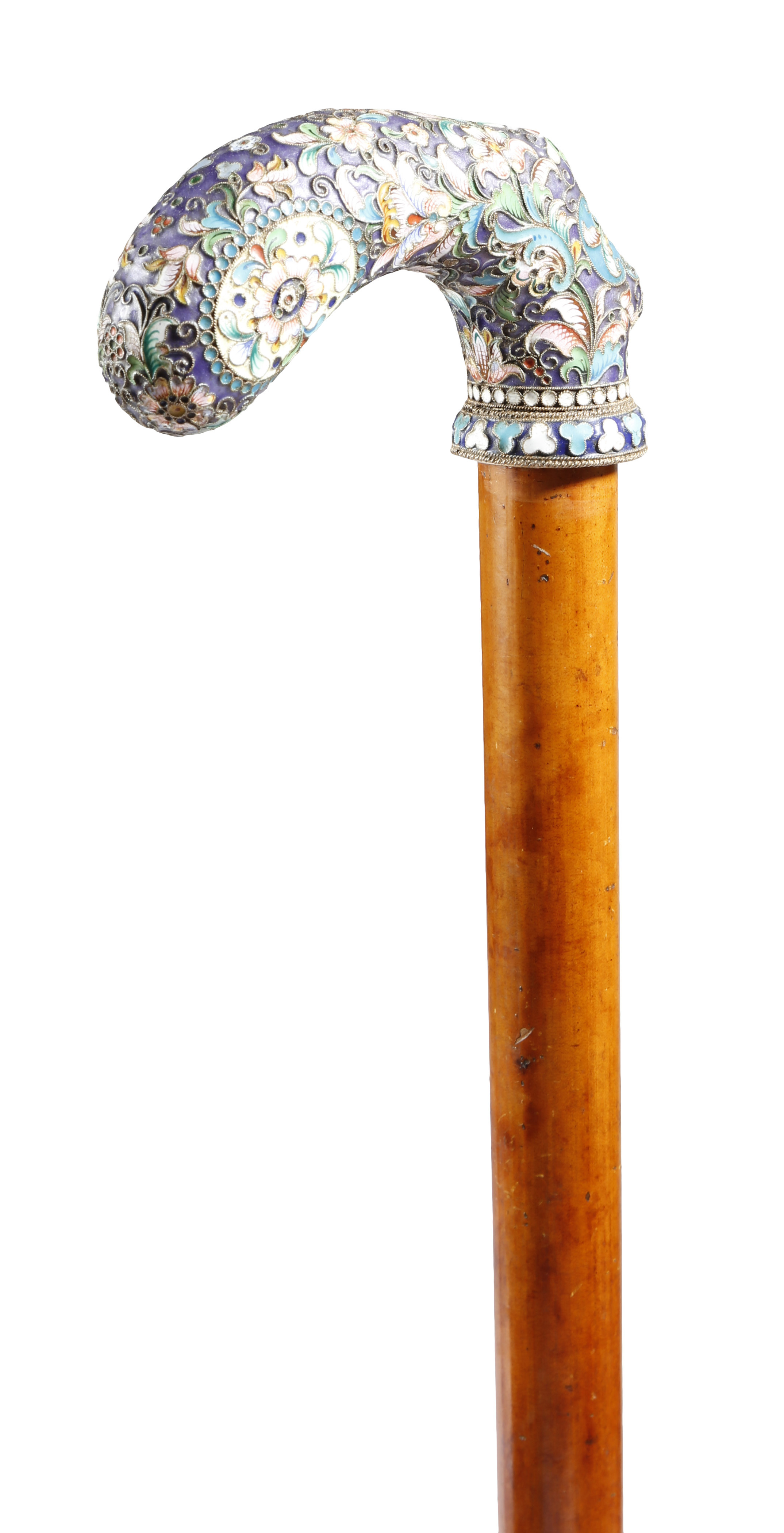 A Russian cloisonné enamel and silver mounted walking cane, the handle decorated with leaves and flowers, the silver marked '84', with a Malacca shaft, 88.9cm long.