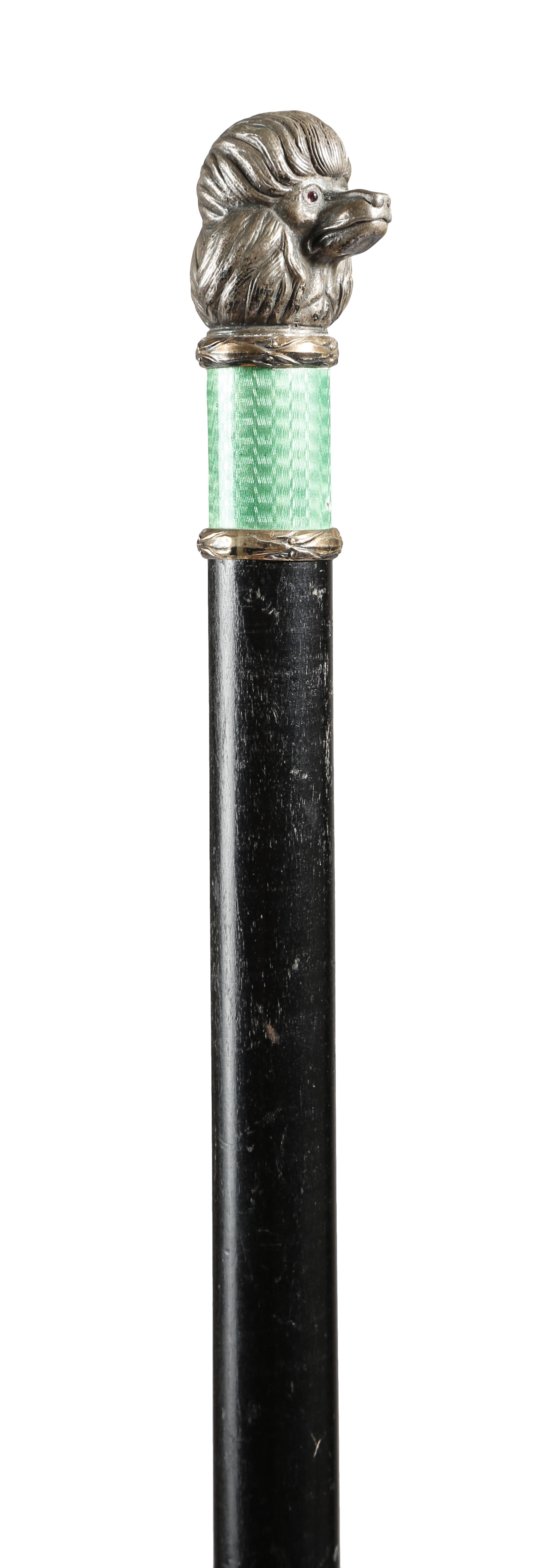 A Russian silver and enamel mounted walking cane, the handle in the form of a poodle dog's head, with glass eyes above laurel leaf borders and a band of green guilloche enamel, marked '88', with an ebonised shaft and bone terminal, 89.4cm long.