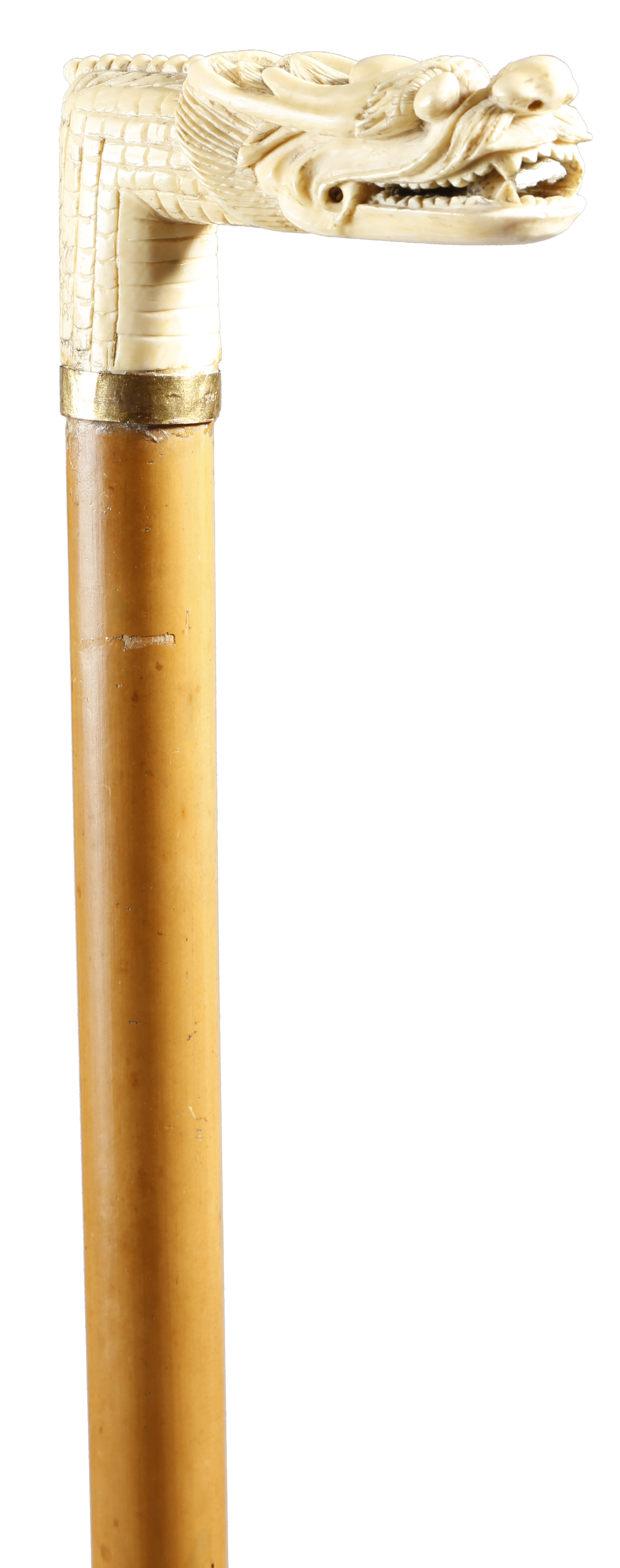 λ Two late 19th century Chinese ivory handled walking canes, carved with dragon's heads, each with a pearl in its mouth, with gilt metal ferrules, one with a Malacca shaft, 96.7cm long (max). (2)
