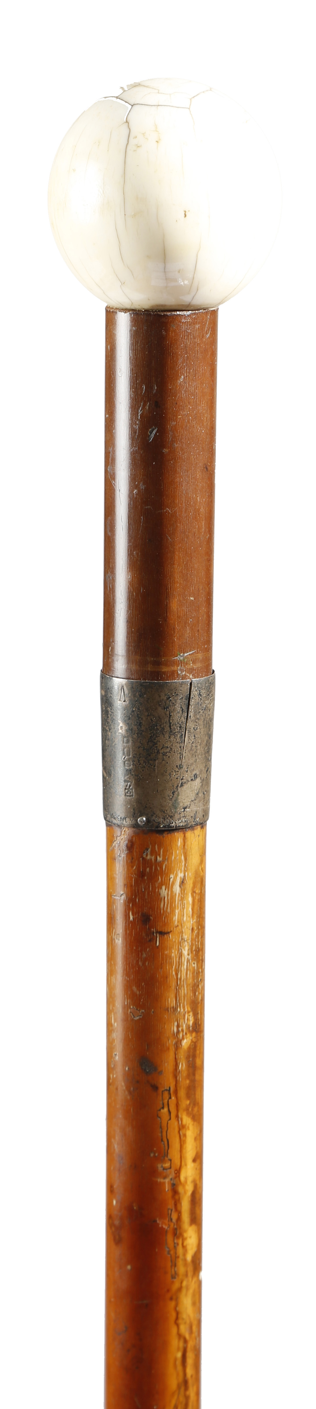λ Five ivory handled walking canes, one marine ivory, with differing shafts, including: Malacca, ebonised and palmwood, one with a worn silver hallmark, late 19th / early 20th century, 92.8cm long (max). (5)