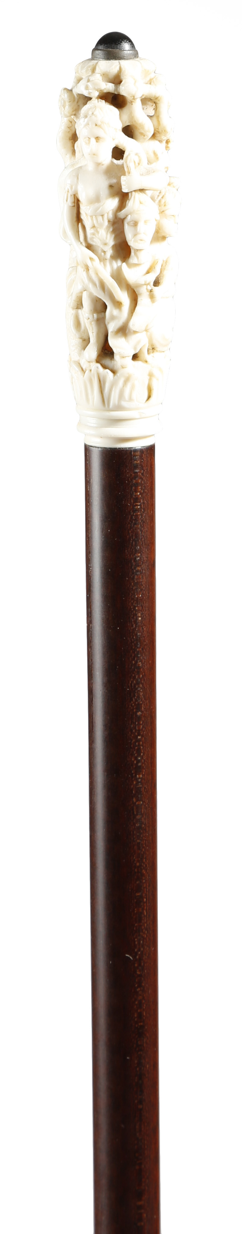 λ A late 19th century walking cane, the ivory handle carved with Judith beheading Holofernes, with a hardwood shaft and a horn terminal, 92.5cm long, together with a late Victorian ivory handled cane, carved with scrolling leaves, flowers and fruit, with an ebonised shaft. (2)