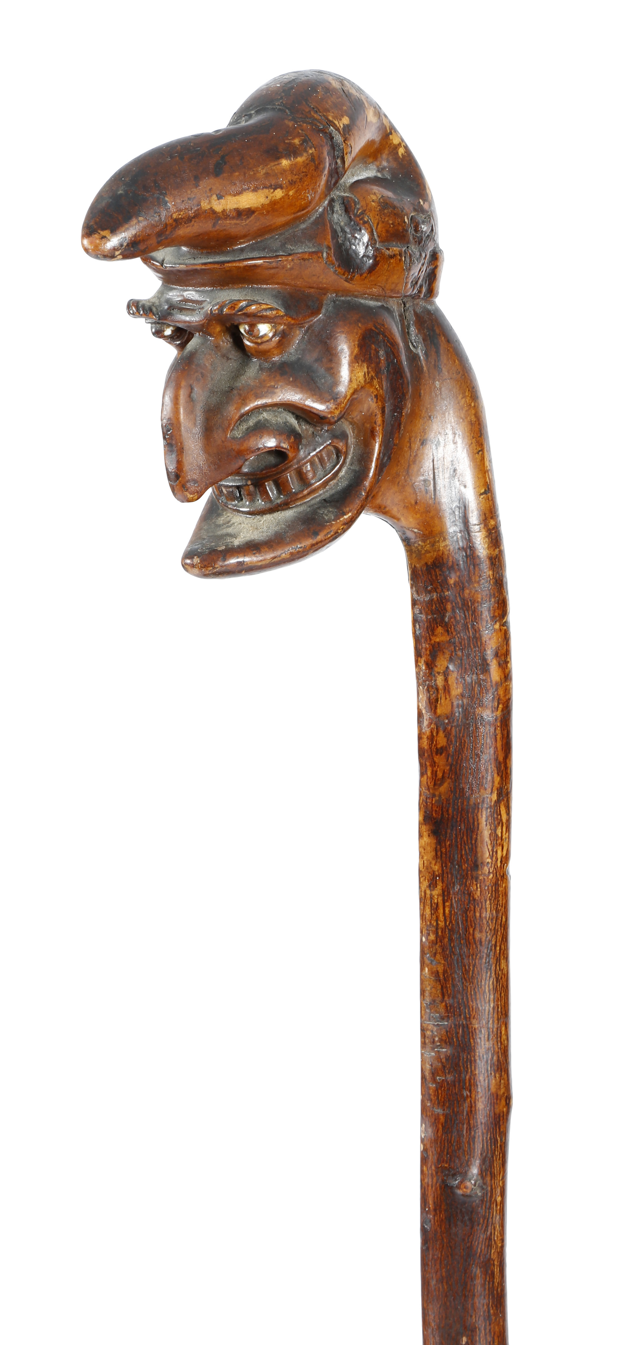 A Victorian folk art treen blackthorn walking cane, the handle carved with a grotesque bust of Punch, with glass eyes, 106.4cm long.