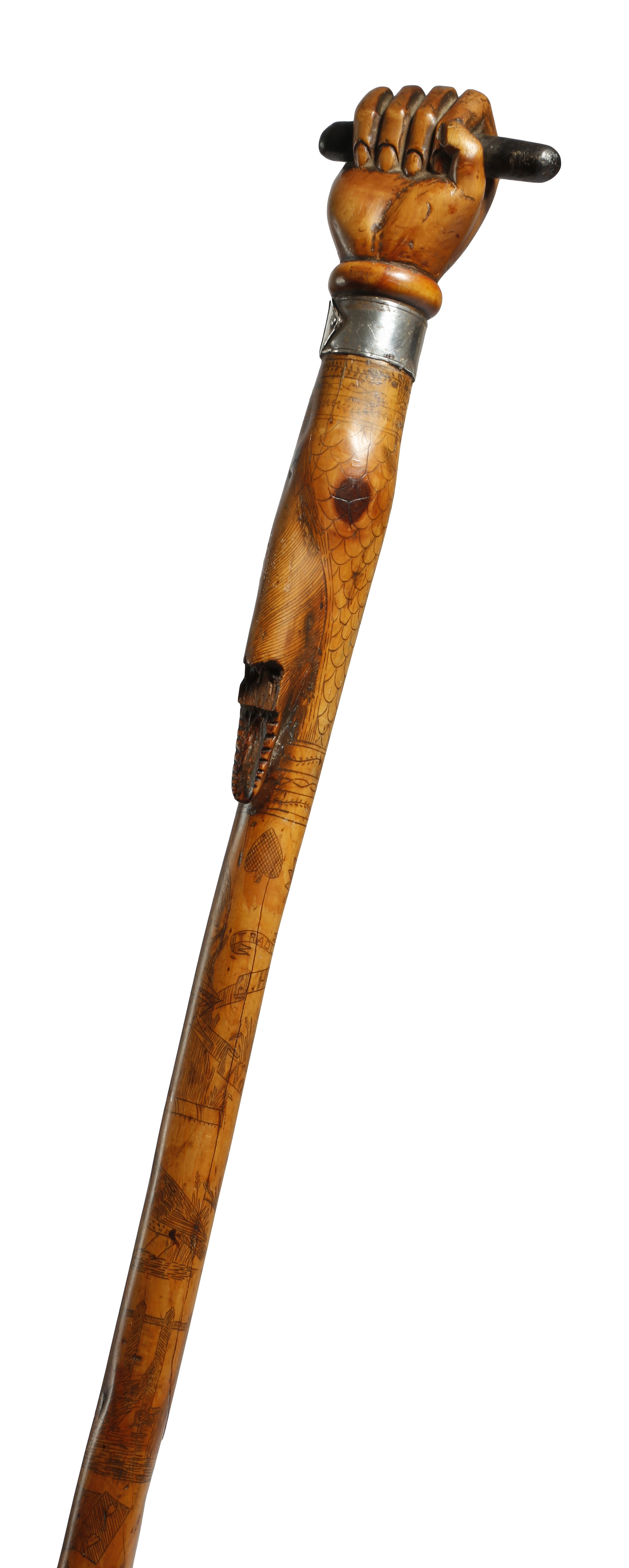 A Victorian folk art penwork decorated walking cane, with a clenched fist handle, with a silver coloured metal ferrule and carved with a crocodile, engraved with various animals, birds and figures undertaking country pursuits, inscribed 'TRADE MARK' and 'J. HOLTOM NOV 2ND 1870', reduced, 74cm long.